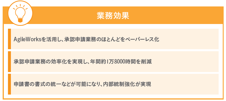 AgileWorksによる電子化は全申請書の3割ほどからスタートし、その約1年後には全申請書の9割にも迫る数となり、導入からわずか1年ほどでほぼすべての申請承認業務のペーパーレス化を達成されました。導入以前にはしばしば起こっていた、古い書式による申請や回付ルートの誤りは激減し、統一された運用ルールによる適正な承認申請業務が実現され、内部統制の強化にも効果を発揮しています。