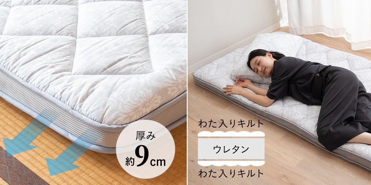 厚み約9㎝のマチ付き構造なので、布団の端までしっかりとした厚みを確保。側面には通気性の良いメッシュ素材を使用。