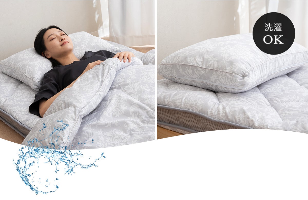 シーズンごとに安心してお使いいただけるよう、掛け布団と枕はご家庭で洗濯が可能です。