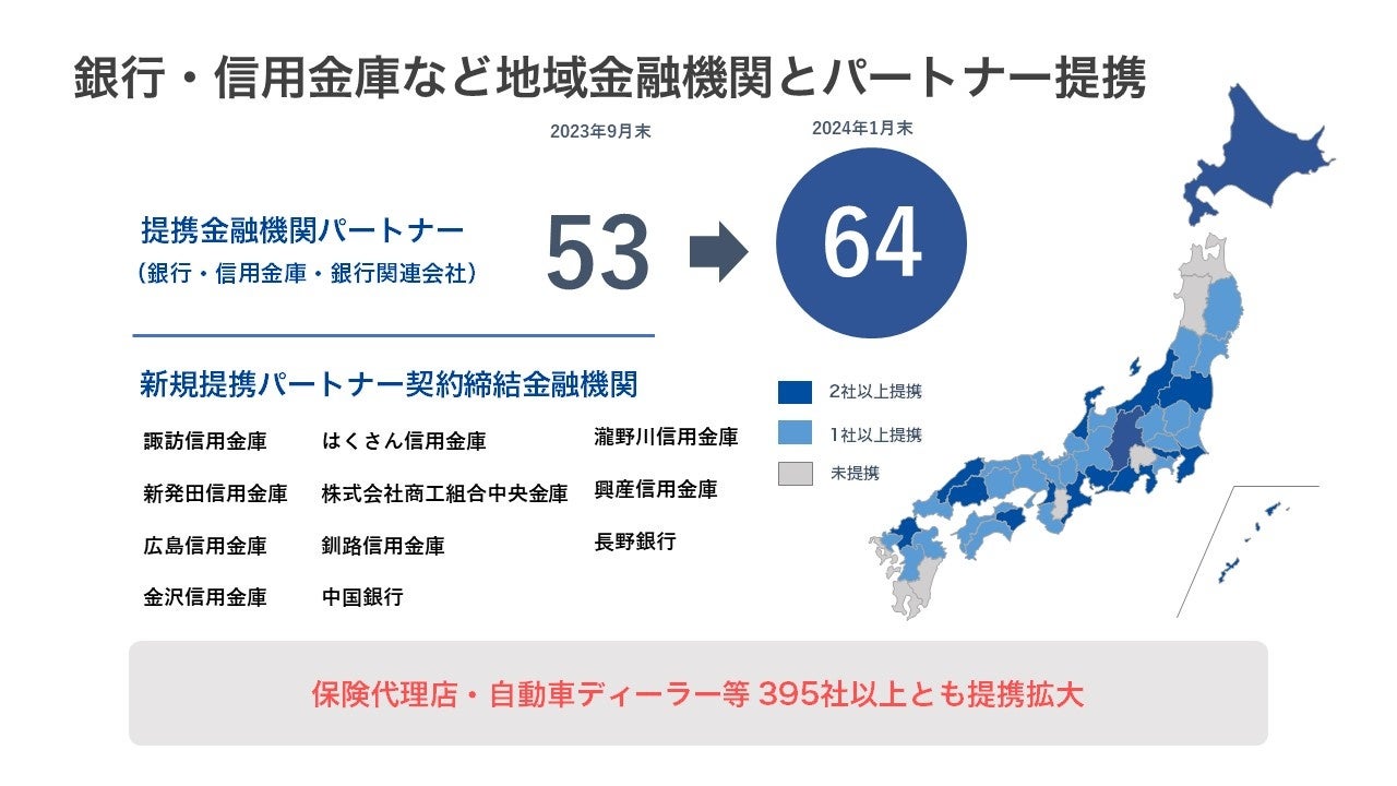 株式会社NEXYZ.は中長期の事業方針としてビジネスマッチングの拡大を進めており、現在64の地域金融機関※、自動車ディーラー等を含む保険代理店395社以上と業務提携しています。