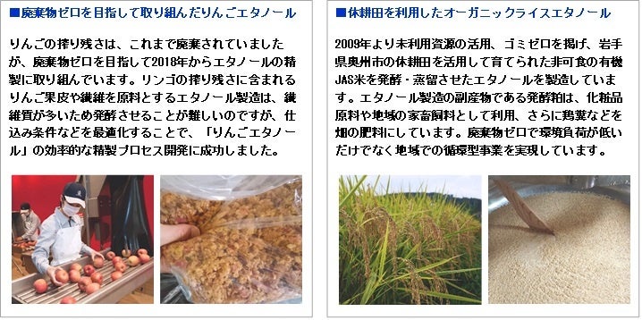 本製品は岩手県の休耕田を活用して作る有機JAS米から作られたオーガニックライスエタノール、青森県のシードルを生産する際に出るリンゴの搾りかすから作られたリンゴエタノールを配合したウエットティッシュです。