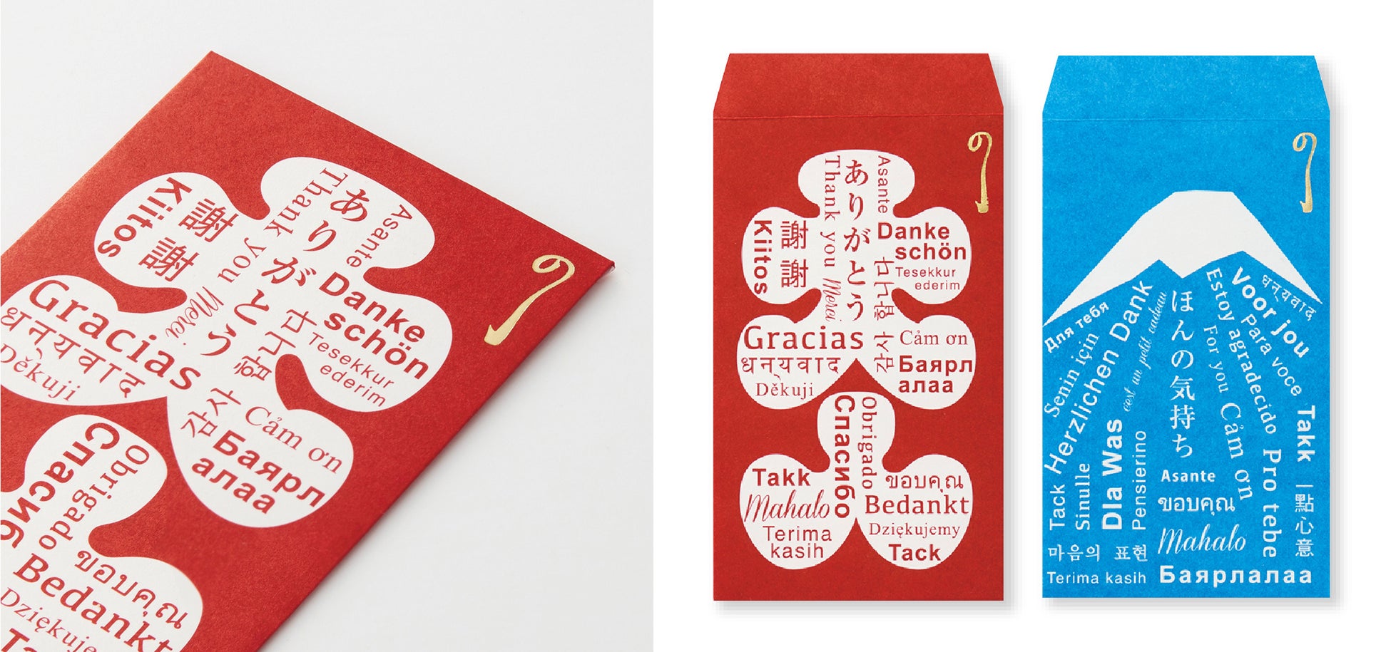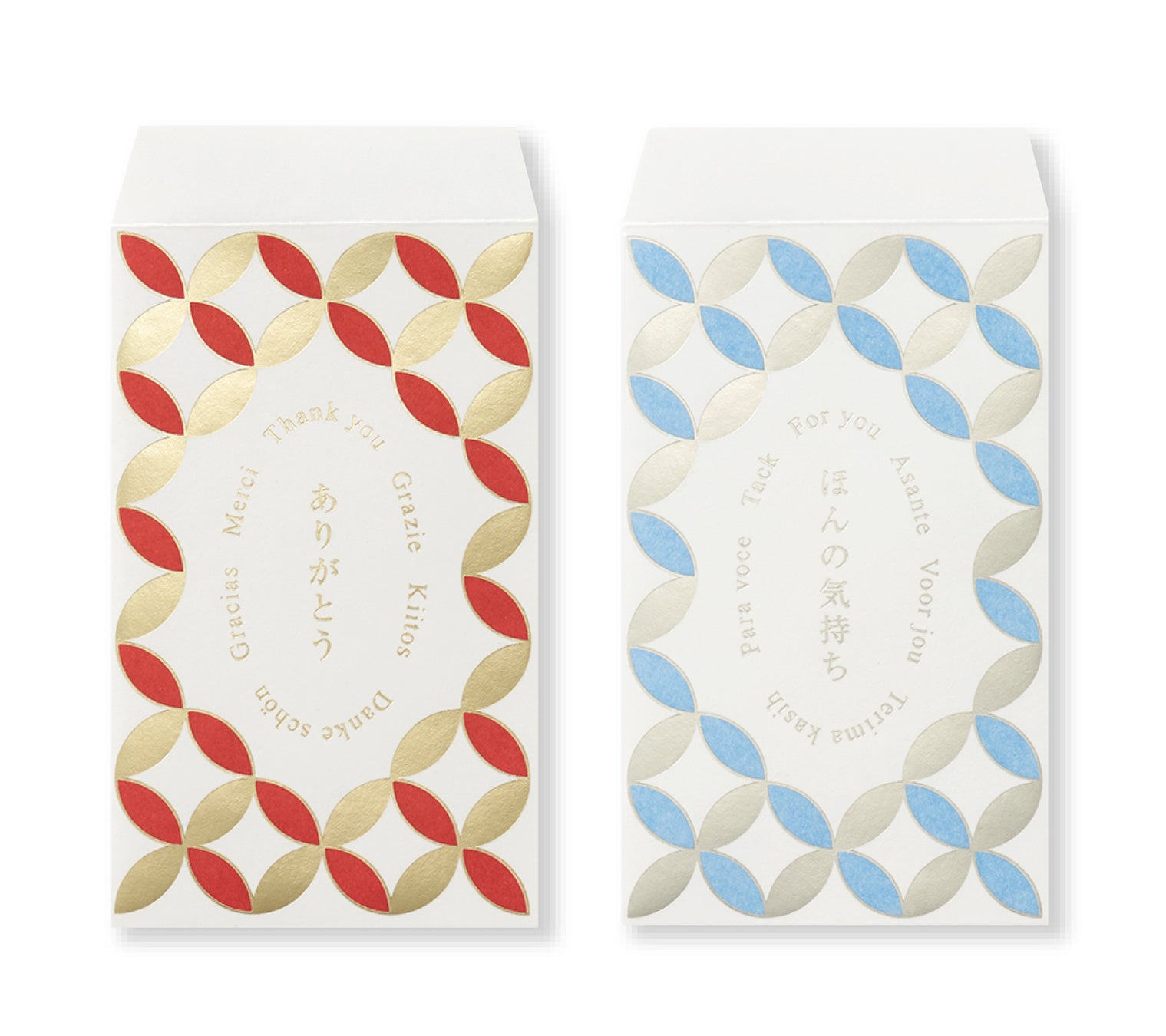 価格:330円(税込)/種類:4種(ありがとう 大入、ほんのきもち 富士、ありがとう 七宝金、ほんのきもち 七宝銀)/製品寸法:65×110mm/内容:本体3枚/製品紹介ページ:https://paper.maruai.co.jp/shop/c/c03039978/