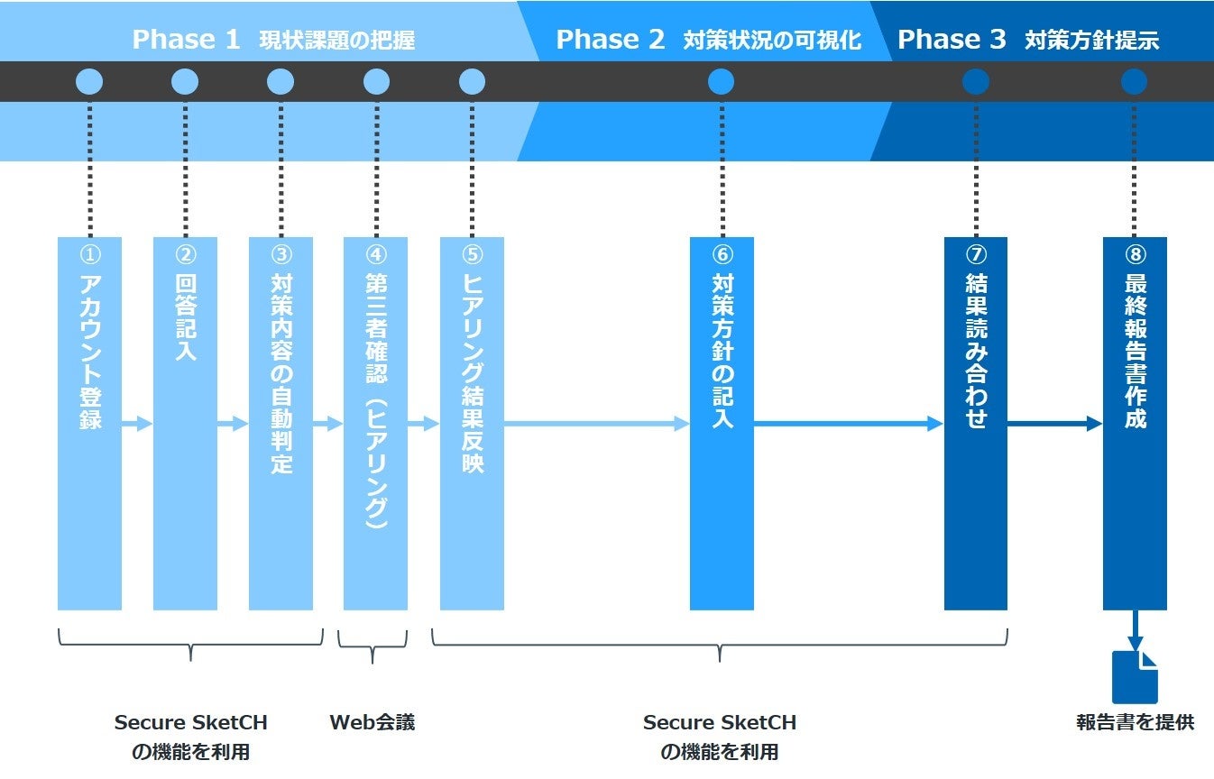 その後、対応の優先度や具体的な進め方をコンサルタントが提案し、最適な対策方針を利用企業とともに決定していきます。決定した方針をSecure SketCHに登録し、今後の状況確認に活用するほか、Secure SketCHによる評価結果に加えて、コンサルタントが最終報告書を作成し提供します。