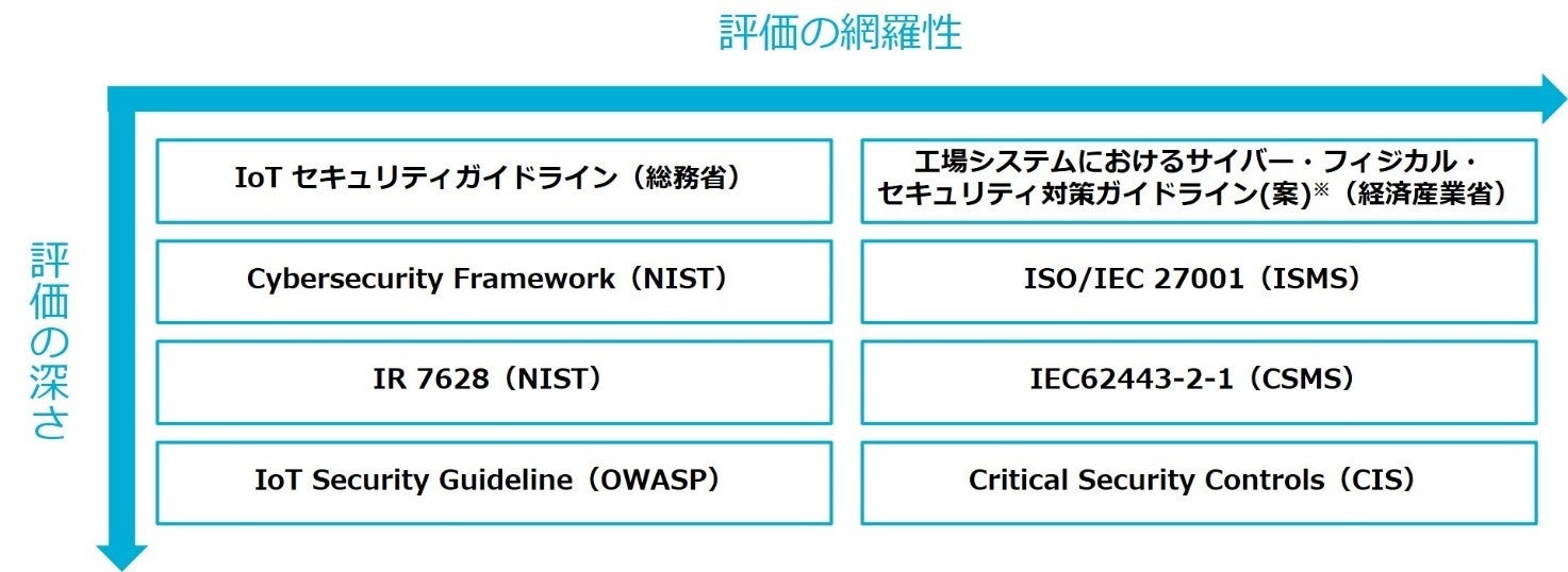 本サービスでは、工場セキュリティに関する国内外の各種ガイドラインを集約して作成した評価項目を用いて、NRIセキュアのコンサルタントがサポートすることで、利用企業の担当者の作業負荷を抑えながらも、セキュリティリスクやその対策状況を客観的かつ網羅的に可視化・評価することができます(図1)。