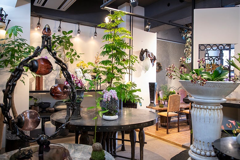 全国にファンを持つ名古屋・星ヶ丘のフラワーギャラリー「藤の花」で、フローリストの藤田千以子氏から苔玉を用いたフラワーアレンジを教わる特別なレッスン。