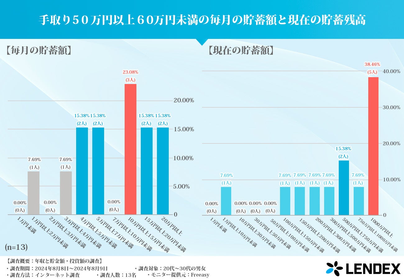 手取り50万円以上60万円未満の層では、毎月の貯蓄額が「10万円以上15万円未満」(23.08%)や「15万円以上20万円未満」(15.38%)が多く見られます。