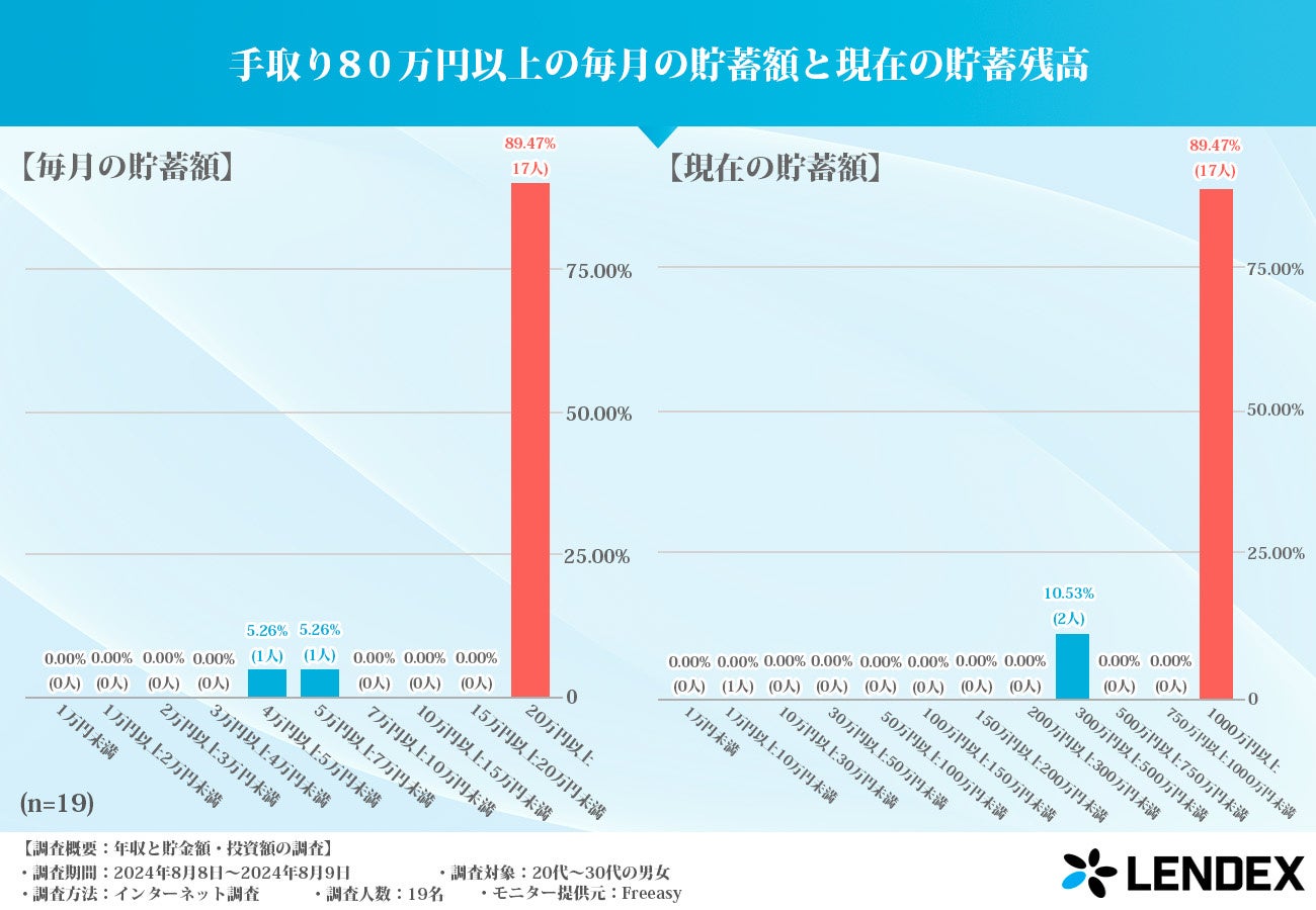 手取り80万円以上の層では、毎月の貯蓄額として「20万円以上」が89.47%を占め、非常に高額な貯蓄が行われています。
