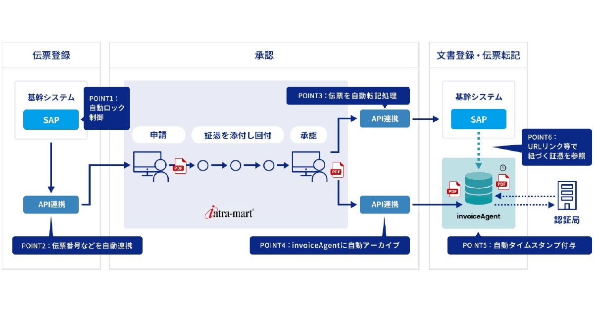 ・「SAP」「invoiceAgent 文書管理」「intra-mart」がリアルタイムでシームレスに連携するAPIを開発・提供したことで、「伝票登記、承認、文書登録・伝票転記」といった一連業務の流れを止めることなく、支払承認まで進められるプロセスを実現