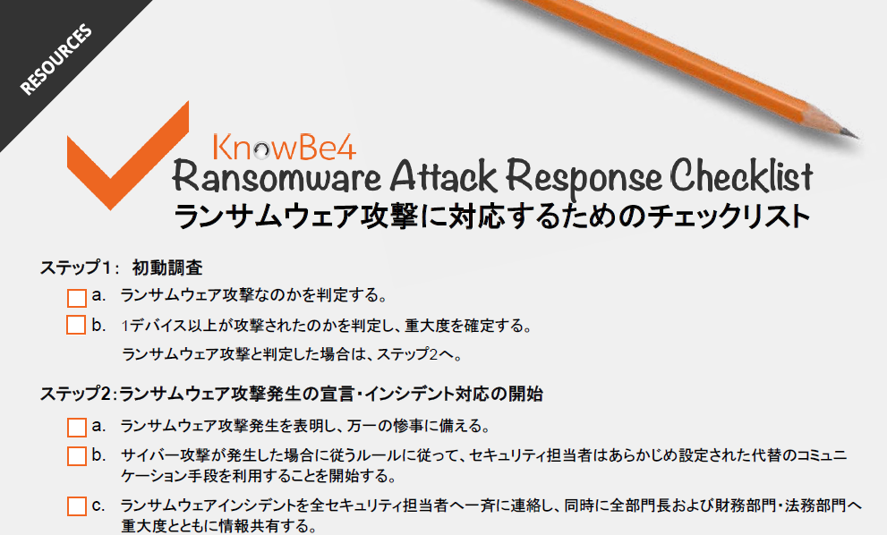 東京(2022年2月24日発) – セキュリティ意識向上トレーニングとフィッシングシミュレーション・分析を組み合わせた世界最大の統合型プラットフォームのプロバイダーであるKnowBe4(本社:米国フロリダ州タンパベイ、創立者兼CEO:Stu Sjouwerman (ストゥ・シャワーマン))は、このたび、ランサムウェアに感染した際の詳細な対処手順や簡易なチェックリストを掲載した「2022年版ランサムウェア人質救出マニュアル」(英文)をリリースしたことを発表します。本プレスリリースは、日本企業または団体様のために、「2022年版ランサムウェア人質救出マニュアル」(英文)の要旨を日本語で要約して解説するためです。また、併せて、本マニュアルの一部であるランサムウェア人質救出チェックリストを日本語に翻訳して、公開します。
