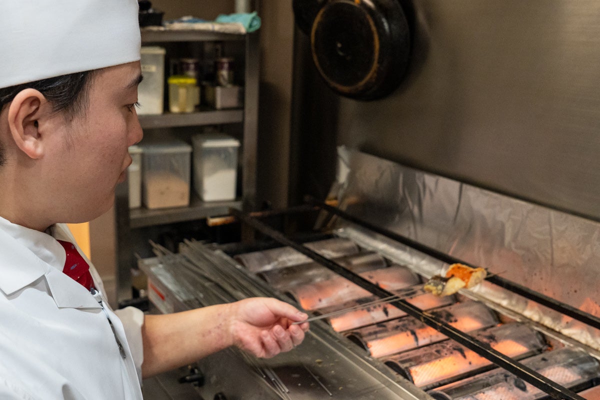 白味噌は焦げやすく、火加減は緊張感すら漂うほど繊細。職人が一切れごとに火の入りを見極め、手を添え、向きを変え、時間をかけて焼き上げます。“外は香ばしく、中はしっとり”という理想の仕上がりを追求し、手仕事だからこそ生まれる味わいをお届けしています。