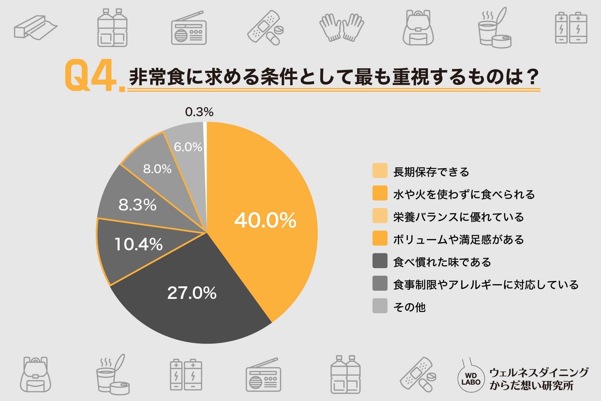 一方で、非常食に求める条件として「長期保存できる」(40.0%)や「水や火を使わず食べられる」(27.0%)に加え、「栄養バランスが取れている」「食事制限やアレルギーに対応している」といった健康面への配慮も重視されるなど、災害時でも“安心して食べたい”という意識の高まりが見られました。