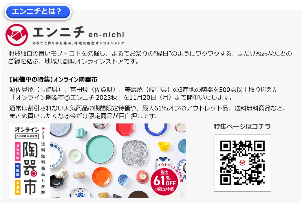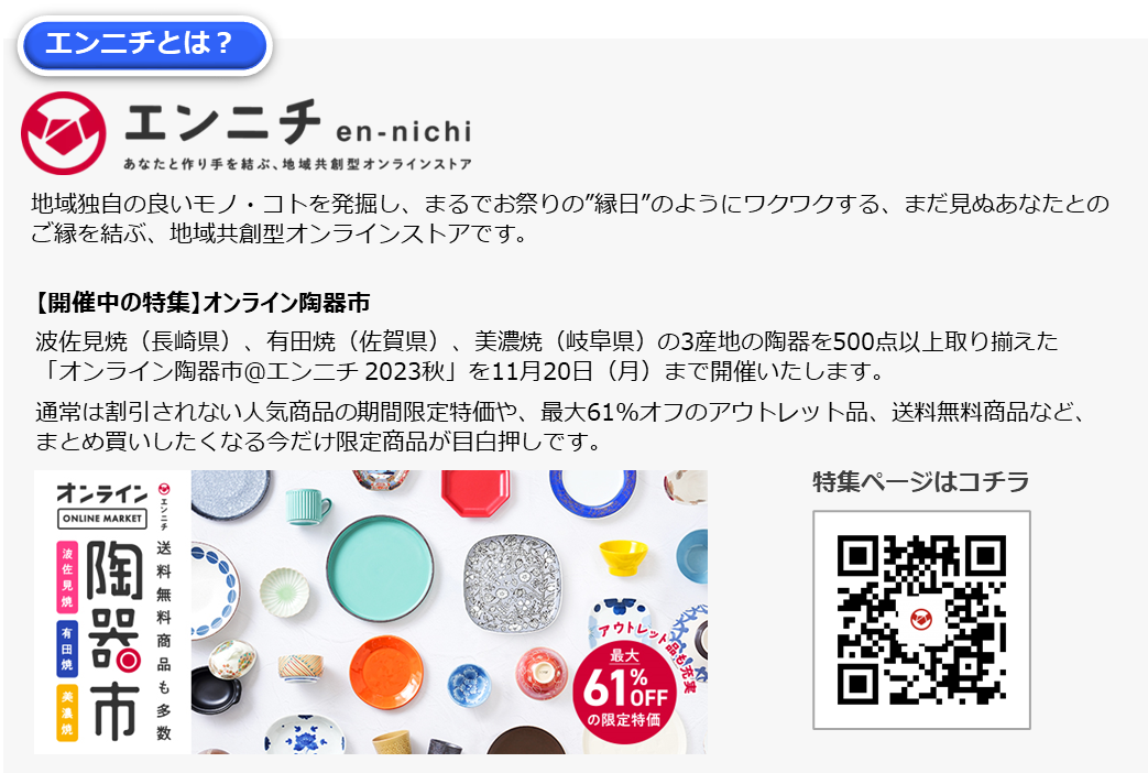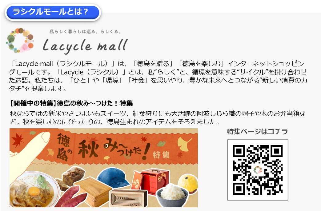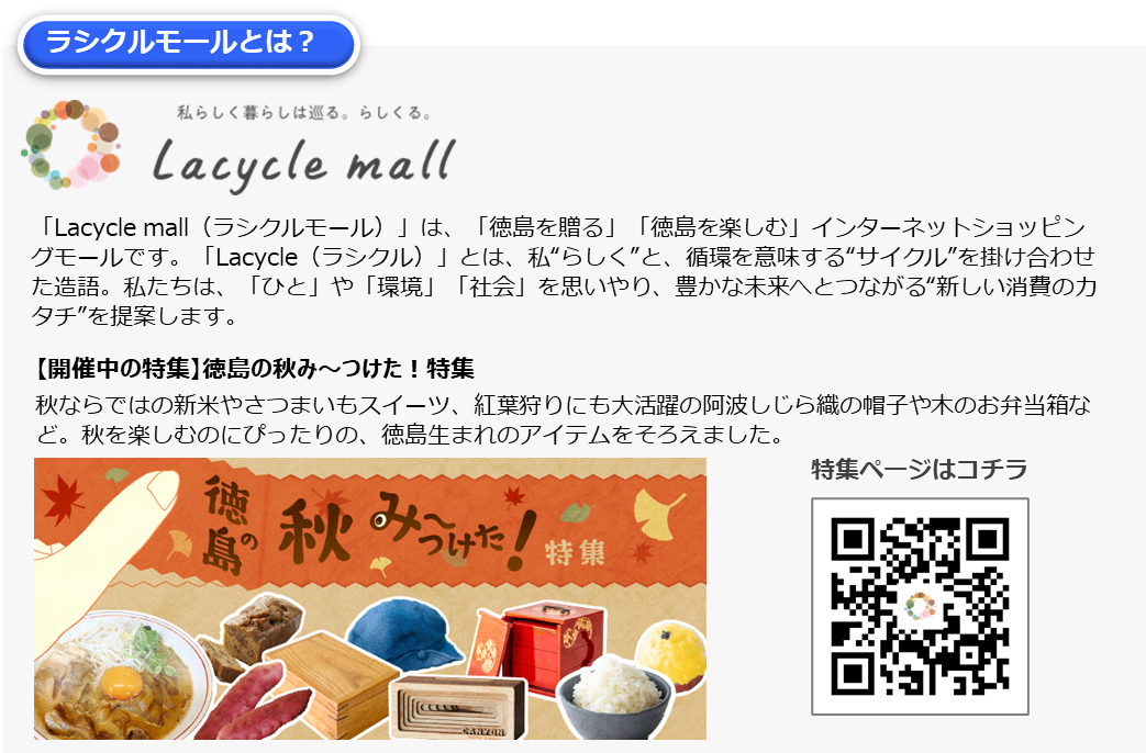 また、キャンペーン期間中、ラシクルモールでは「徳島の秋み~つけた!」特集、エンニチでは「オンライン陶器市」を実施しています。