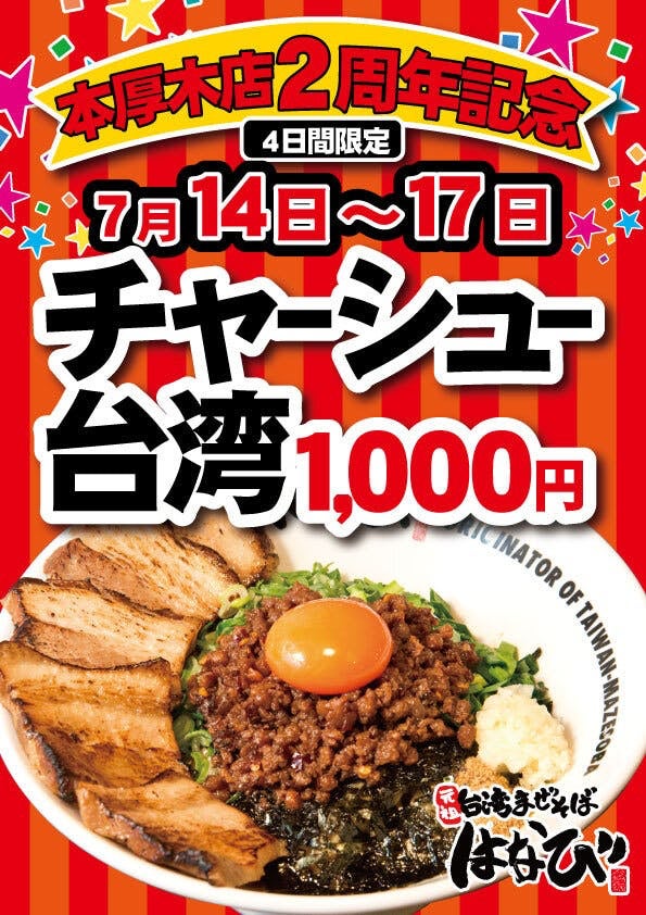 【OPEN2周年記念】 名古屋発祥のソウルフード「台湾まぜそば」を提供する「麵屋はなび本厚木店」が2周年を記念して、「チャーシュー台湾まぜそば」を期間限定で販売します!