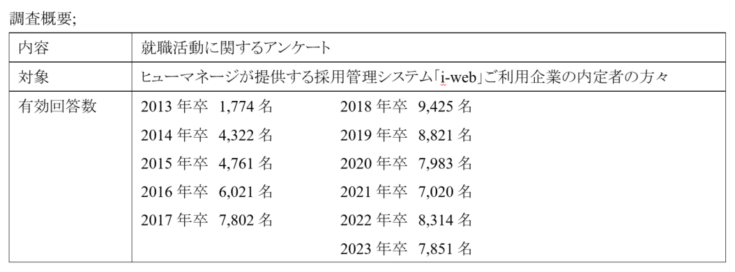 人材の“採用”から“定着”、その先の“活躍”までを支援する人材サービス事業を展開する株式会社ヒューマネージ(本社:東京都千代田区、代表取締役社長:齋藤 亮三、以下ヒューマネージ)は、2023年4月入社予定の大学生・大学院生7,851名に実施した、「2023年卒 就職活動に関するアンケート」の結果を発表した。