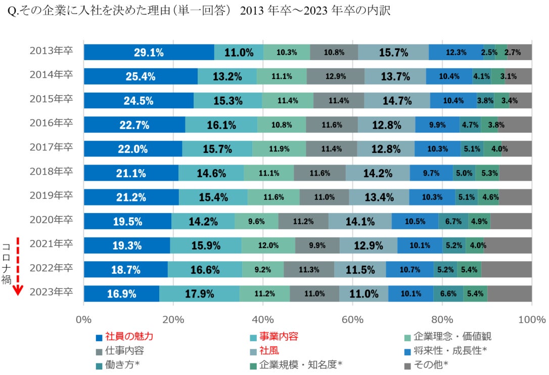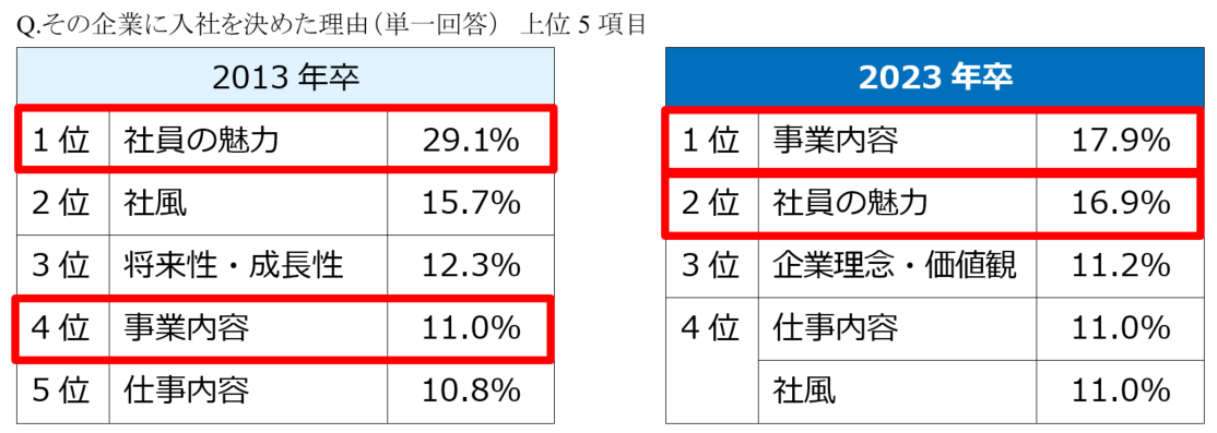 【2013年卒→2023年卒】《大学生の就職活動に関するアンケート調査比較》入社先を決めた理由、「社員の魅力」が半減し、「事業内容」が最多に。