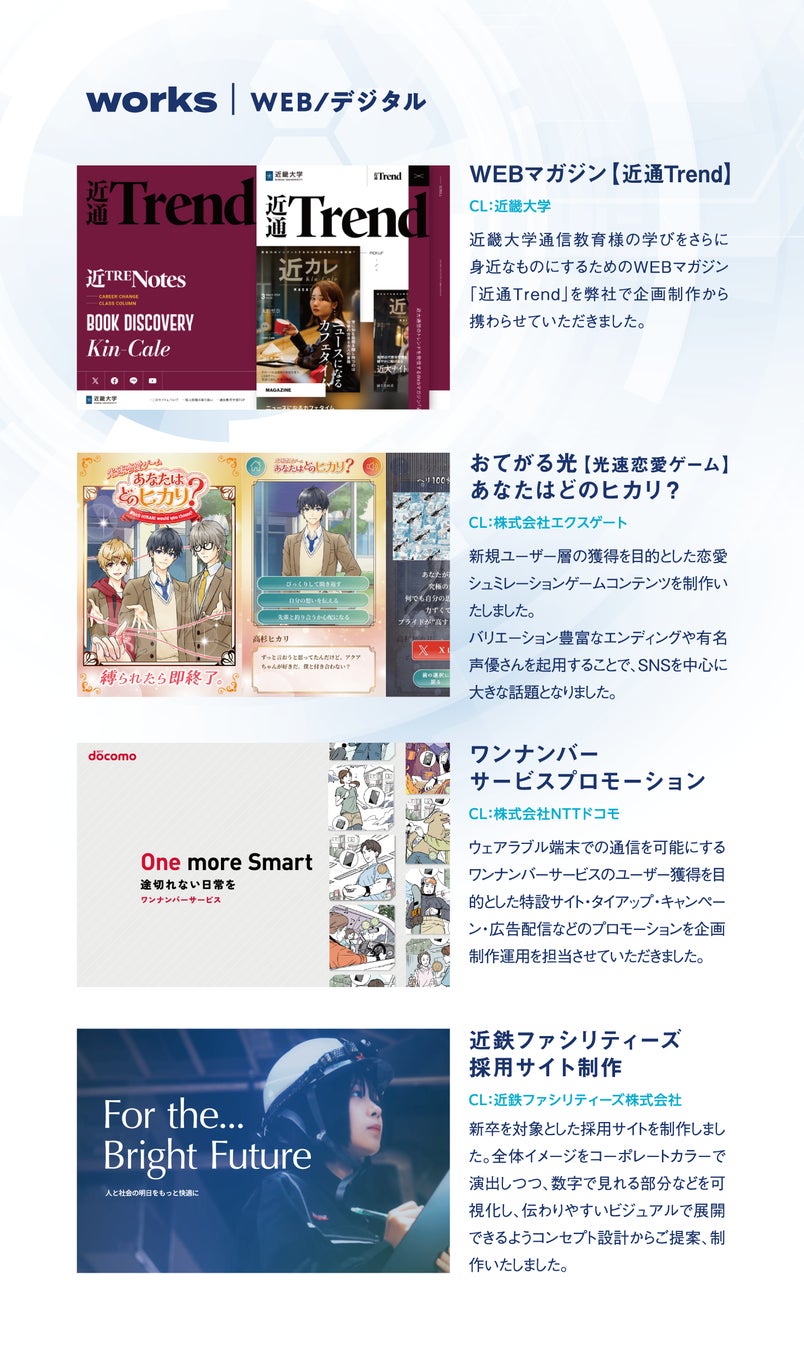 企業が抱える課題をビジュアルとデジタルの力で解決するプロモーションの提案を企画~実制作、運用改善まで行っており、総合的な意味で「デジタルクリエイティブカンパニー」となっています。