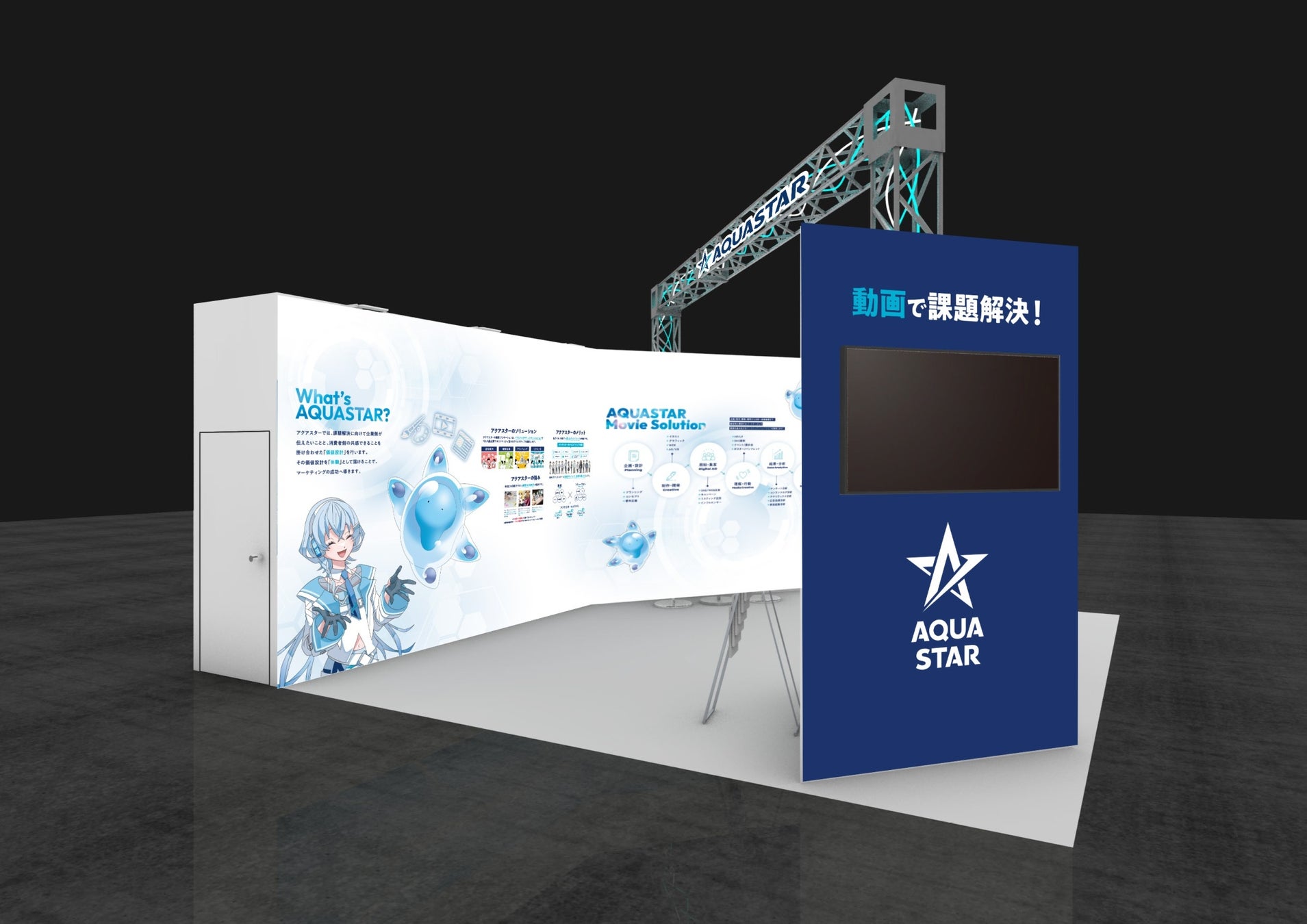 アクアスターのブースは、「NEO Advertising」をテーマに、青と白を基調とした近未来的なデザインで、ネオンのライトアップが目を引きます。