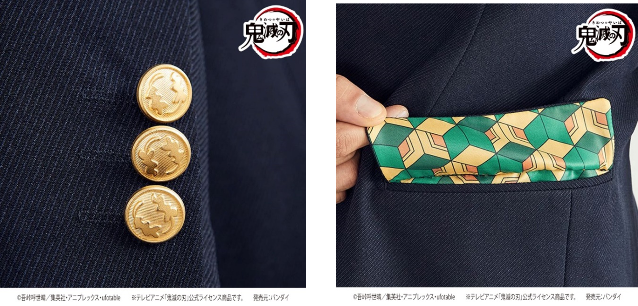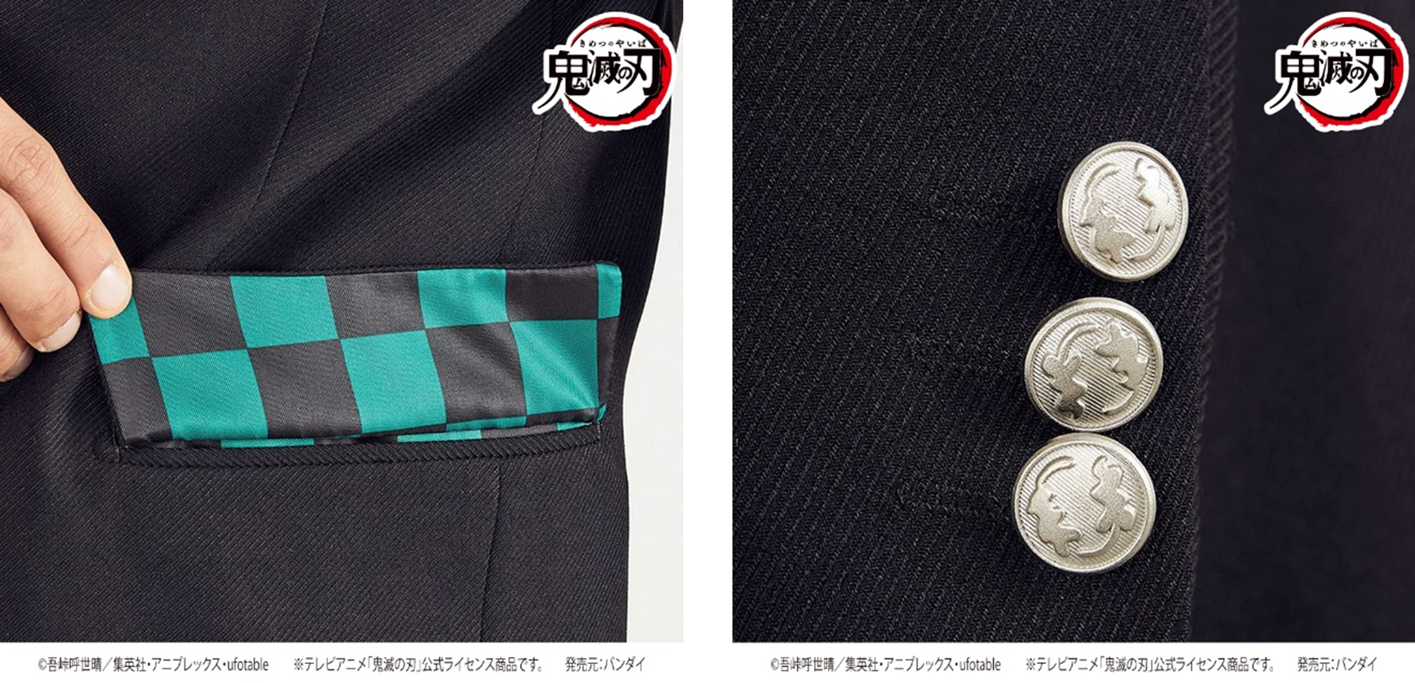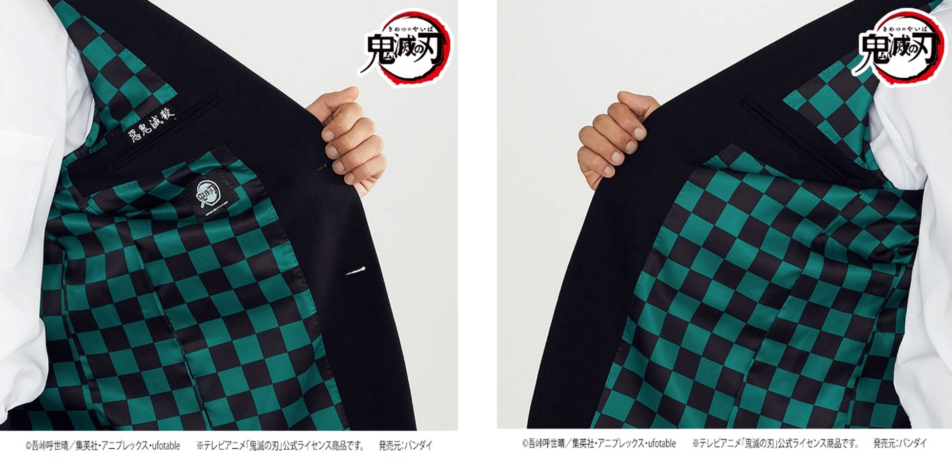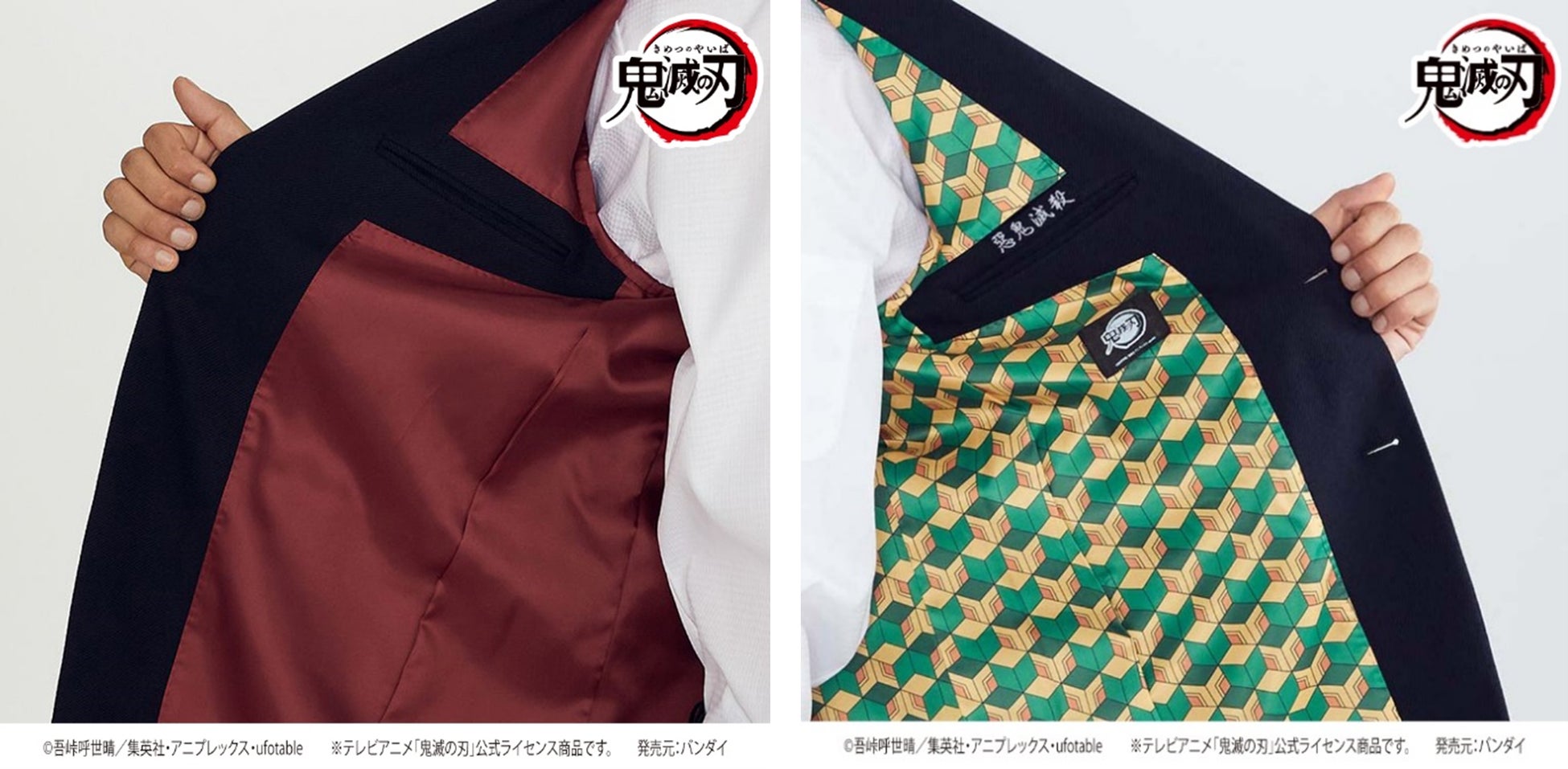 新たに展開するジャケット・パンツはテレビアニメ「鬼滅の刃」に登場する竈門炭治郎、冨岡義勇をモチーフにし、それぞれを連想させるデザインとなっております。裏地や内ポケットの仕様など細部までモチーフを使用し、着るだけでかっこよく仕上がるジャケット・パンツとなっています。