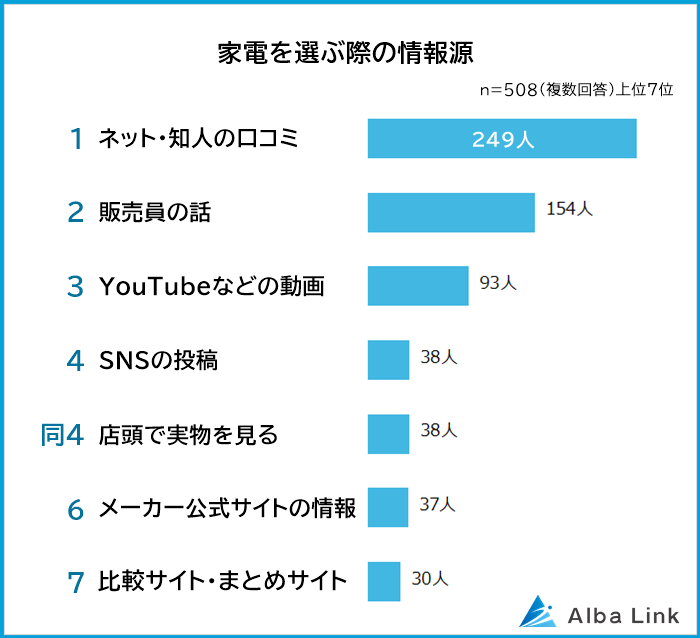 「家電を選ぶ際に何から情報を得るか」を聞いたところ、「ネット・知人の口コミ(249人)」を挙げた人が半数近くと圧倒的1位でした。