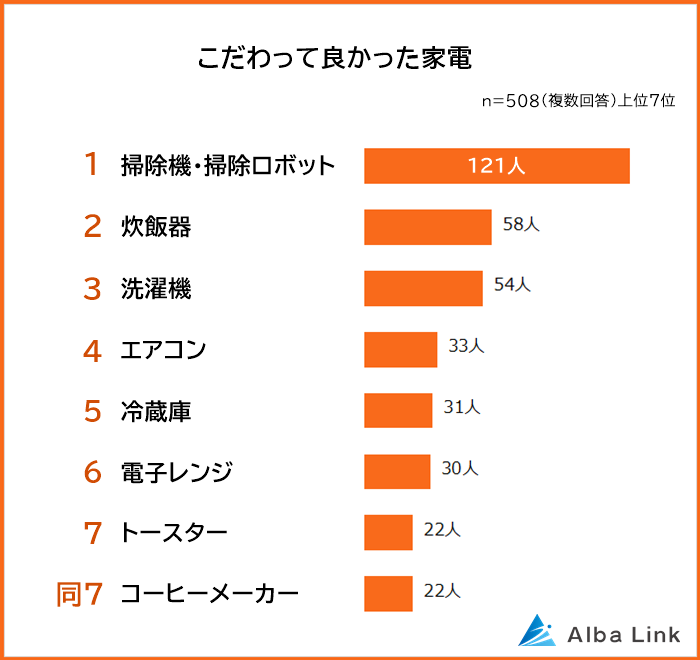 今回、株式会社AlbaLink( https://albalink.co.jp/ )が運営する訳あり物件買取ナビ( https://albalink.co.jp/realestate/ )は、全国の男女508人を対象に「こだわってよかった家電」についてアンケート調査を実施しました。