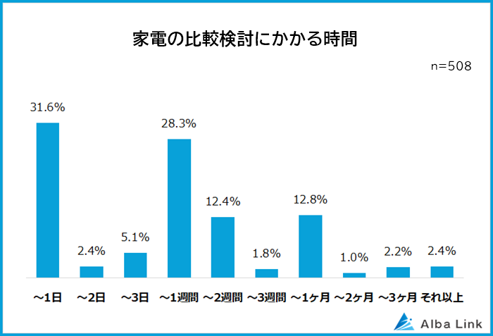 「家電を購入する際の比較検討にかかる時間」で最も多かった回答は「~1日(1日で決める)」でした。短時間で口コミやスペックを調べて、購入する商品を決めてしまう人が多いようです。