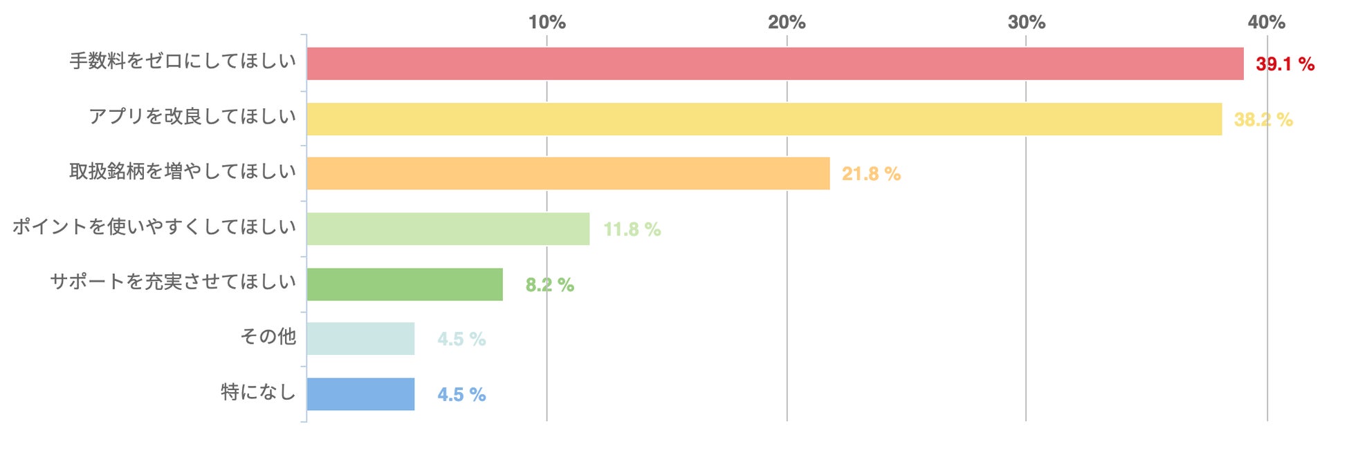 アンケートによれば、「手数料を0にしてほしい(39.1%)」「アプリをさらに改良してほしい(38.2%)」といった要望が寄せられた。