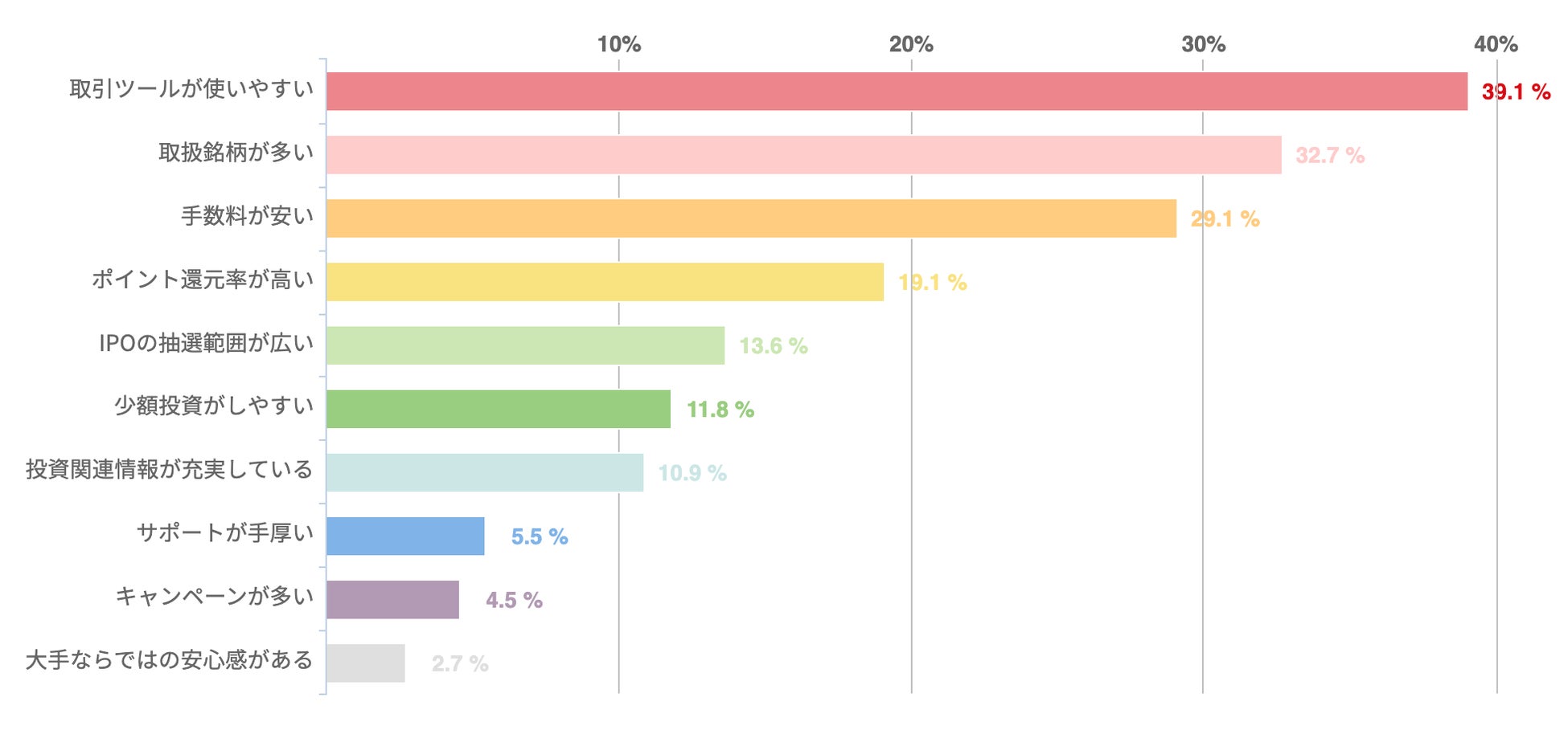 アンケートによれば、顧客が評価している主な点は、「取引ツールの使いやすさ(39.1%)」と「取扱銘柄の多さ(32.7%)」であった。