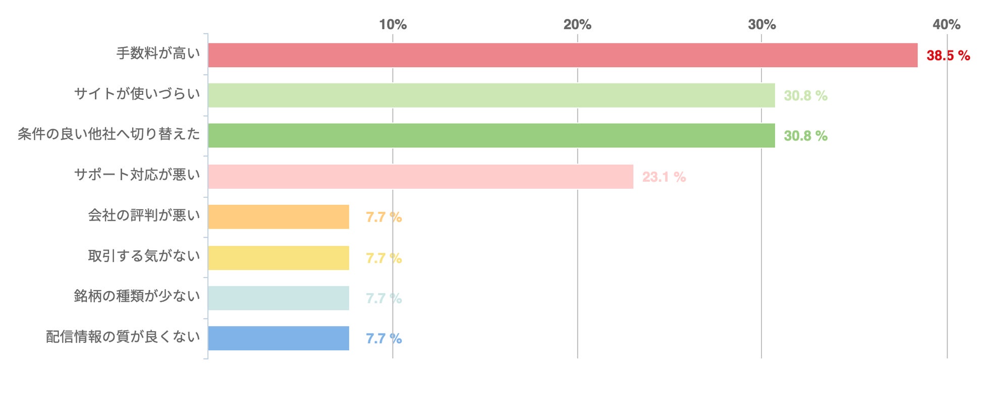 具体的には、「SBI証券や楽天証券などのネット証券と比較して手数料が高かった」「一日定額手数料コースの日額550円が自分にとって非常に高い値段設定だった」といった不満が挙げられた。