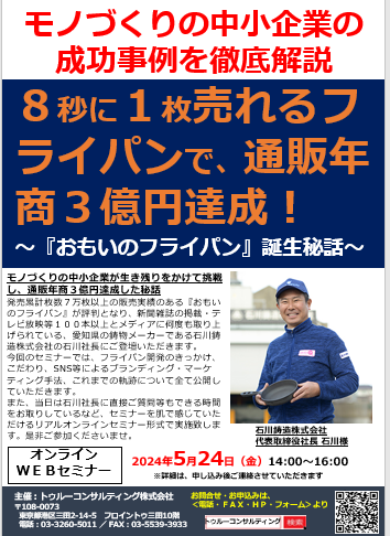 愛知県の鋳物メーカーがヒット商品「おもいのフライパン」で通販年商3億円を達成した、『モノづくりの中小企業の生き残りをかけた戦略大公開セミナー!』を2024年5月24日(金)に開催いたします。