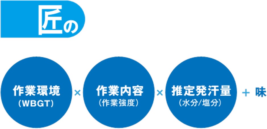サラヤの業務用食品ブランド「匠の」シリーズは、職場環境に合わせて最適な塩分補給方法を選択できる食品ブランドです。「作業環境」「作業内容」「推定発汗量」「味」を弊社独自で算出し、職場環境に応じた商品展開を行い、炎天下などでも安心して働けるようにサポートします。