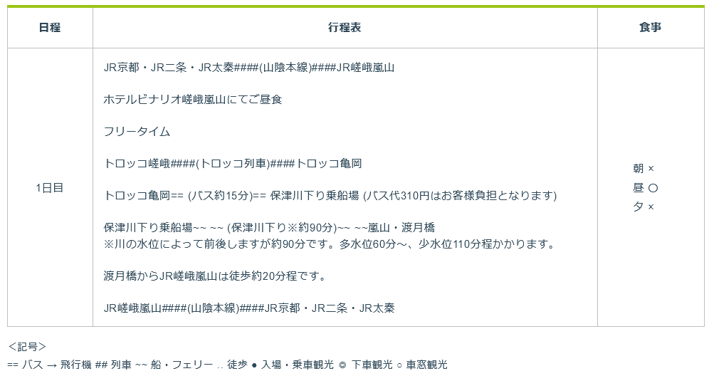 京都嵯峨野のホテルでランチ+トロッコ列車+保津川下り+往復JRがセットになったプラン。(4月29日~5月8日は対象外)