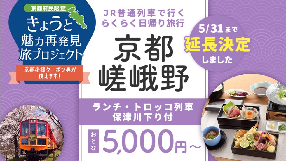 【5月31日迄延長!京都府民限定!】これだけ付いて5,000円‼️さらに2,000円クーポン付往復JRで行く京都嵯峨野のホテルでランチ+トロッコ列車! 保津川舟下り付お得なパック