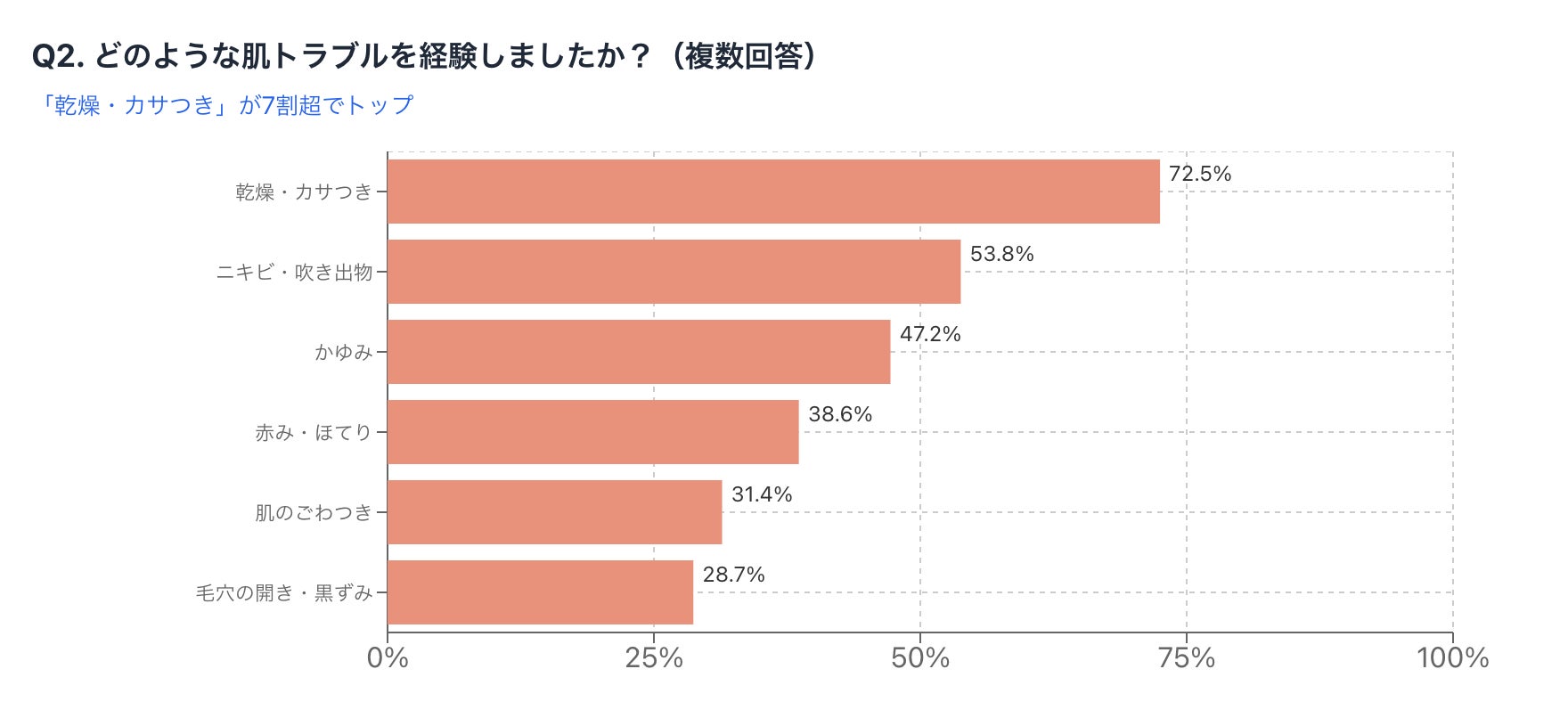 その結果、「乾燥・カサつき」が72.5%で最も多く、次いで「ニキビ・吹き出物」(53.8%)、「かゆみ」(47.2%)という結果になりました。