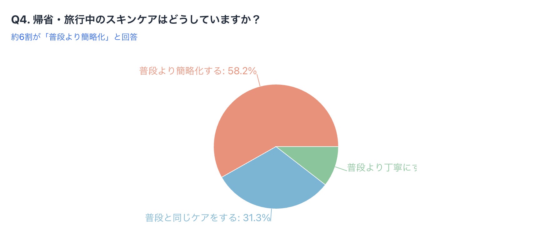 その結果、「普段より簡略化する」が58.2%と最も多く、「普段と同じケアをする」(31.3%)、「普段より丁寧にする」(10.5%)という結果になりました。