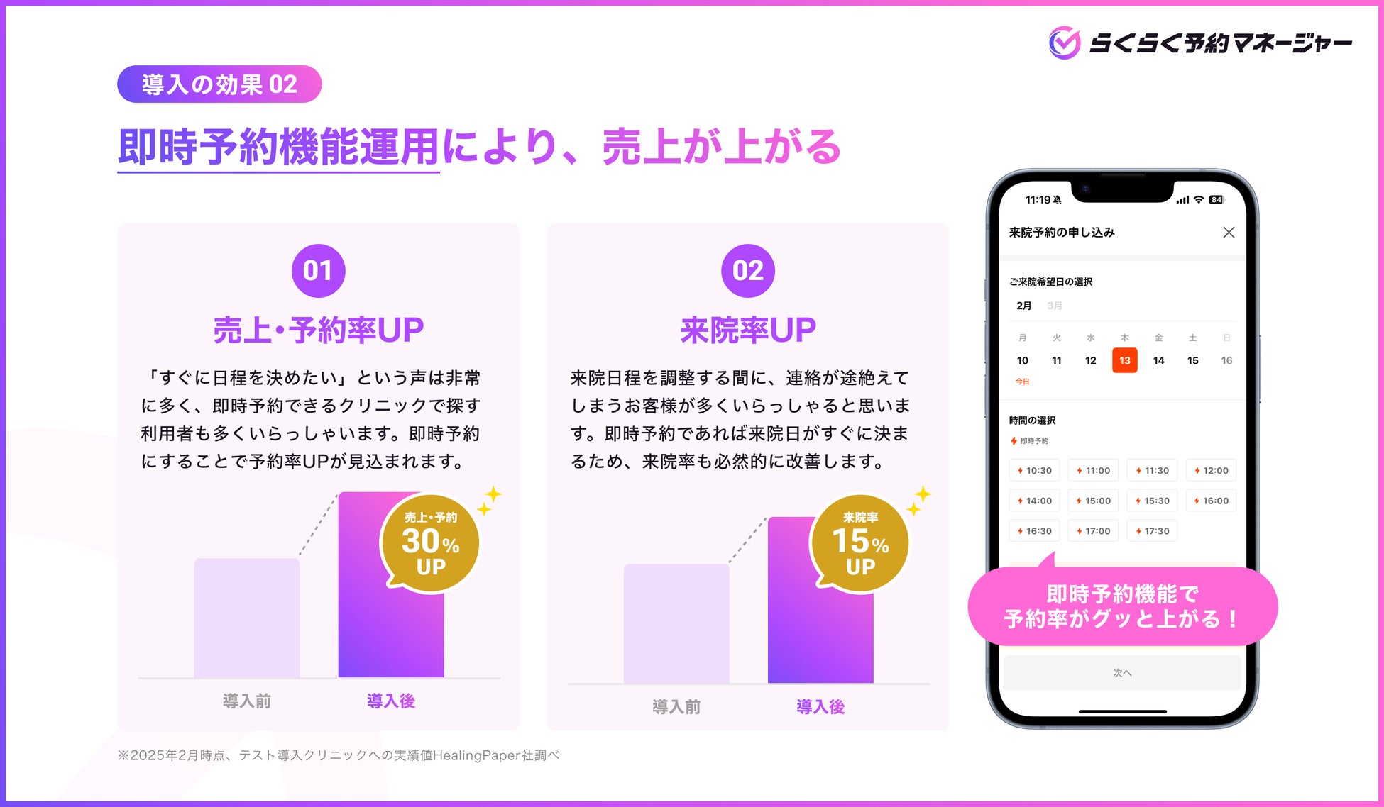 *2 2025年2月時点、らくらく予約マネージャー導入クリニックの実績平均値HealingPaper社調べ