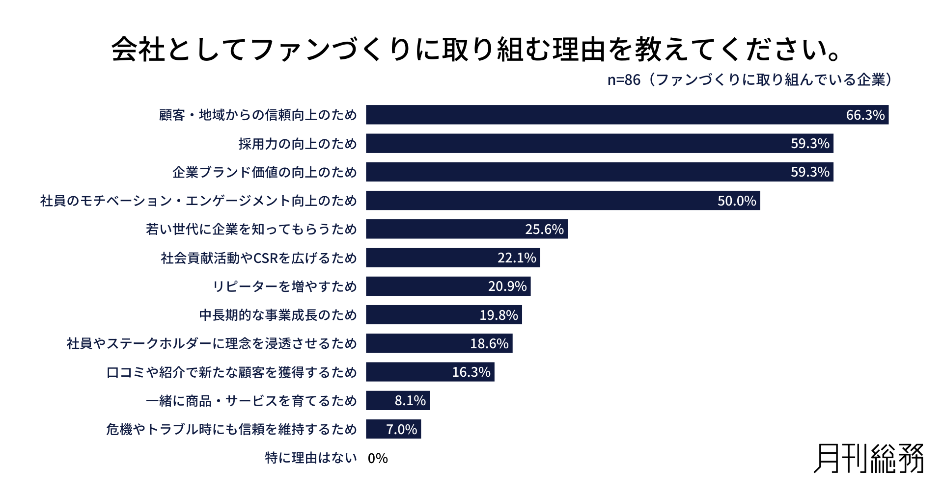 会社としてファンづくりに取り組む理由を尋ねたところ、「顧客・地域からの信頼向上のため」が66.3%で最も多く、「採用力の向上のため」と「企業ブランド価値の向上のため」がともに59.3%と続きました。短期的な売上よりも、信頼や人材確保といった中長期的価値を重視する姿勢が見られます(n=86/ファンづくりに取り組んでいる企業)。