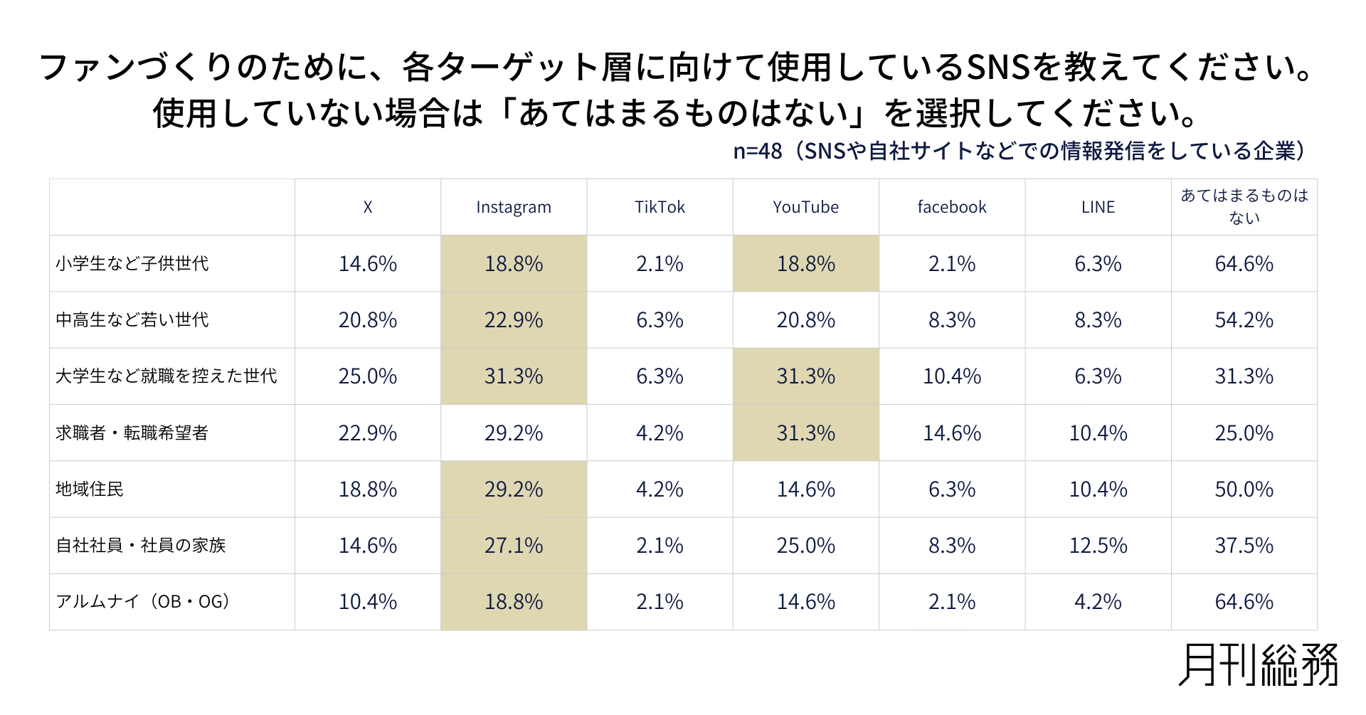 ファンづくりのために各ターゲット層に向けて使用しているSNSを尋ねたところ、大学生など就職を控えた世代では「Instagram」と「YouTube」がともに31.3%と比較的高く、求職者・転職希望者でも「YouTube」が31.3%、「Instagram」が29.2%となりました。一方で、小学生など子供世代やアルムナイでは「あてはまるものはない」が6割を超えており、ターゲットによってSNS活用が十分に行き届いていない状況がうかがえます(n=48/SNSや自社サイトなどでの情報発信をしている企業)。