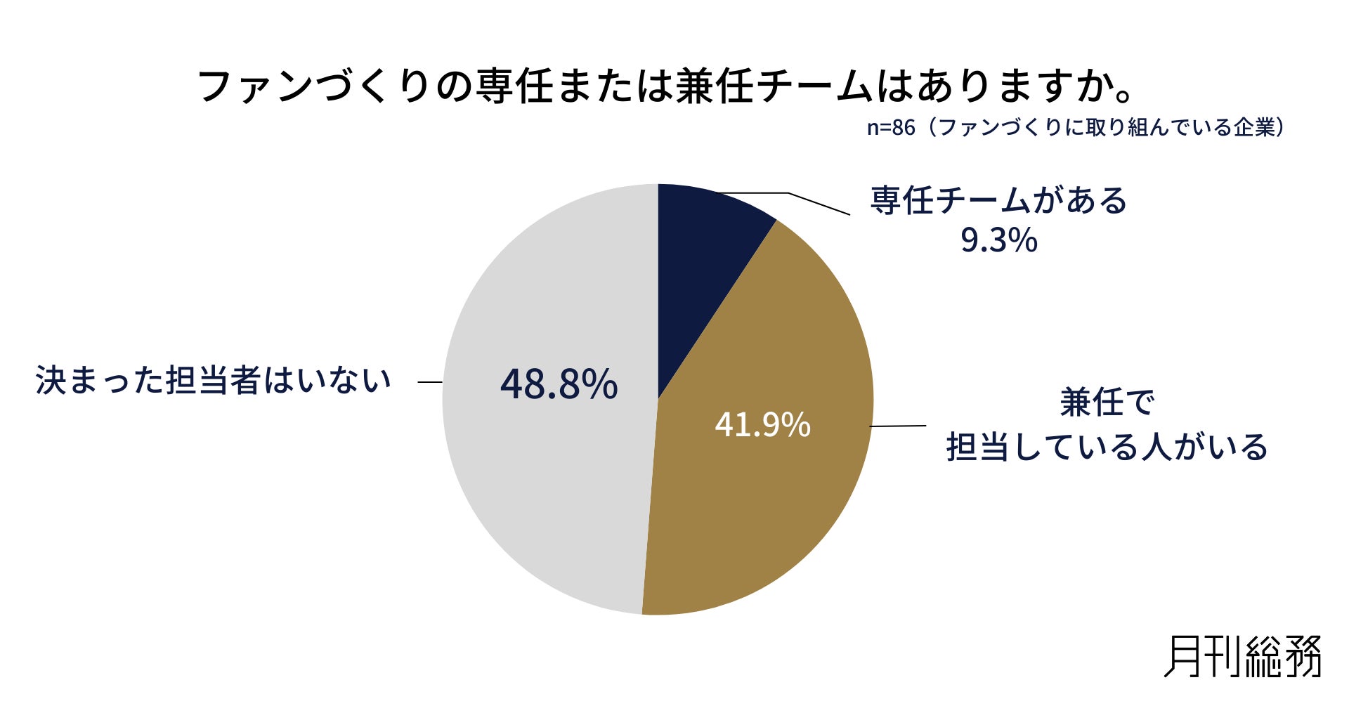 ファンづくりの専任または兼任チームの有無を尋ねたところ、「専任チームがある」は9.3%にとどまり、「決まった担当者はいない」が48.8%となりました(n=86/ファンづくりに取り組んでいる企業)。