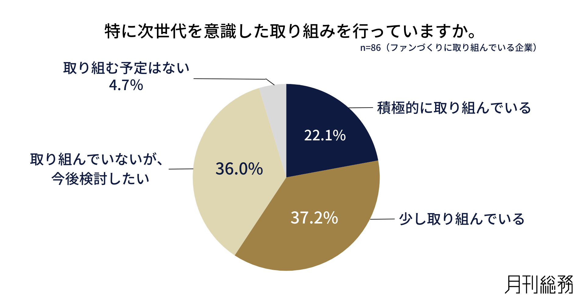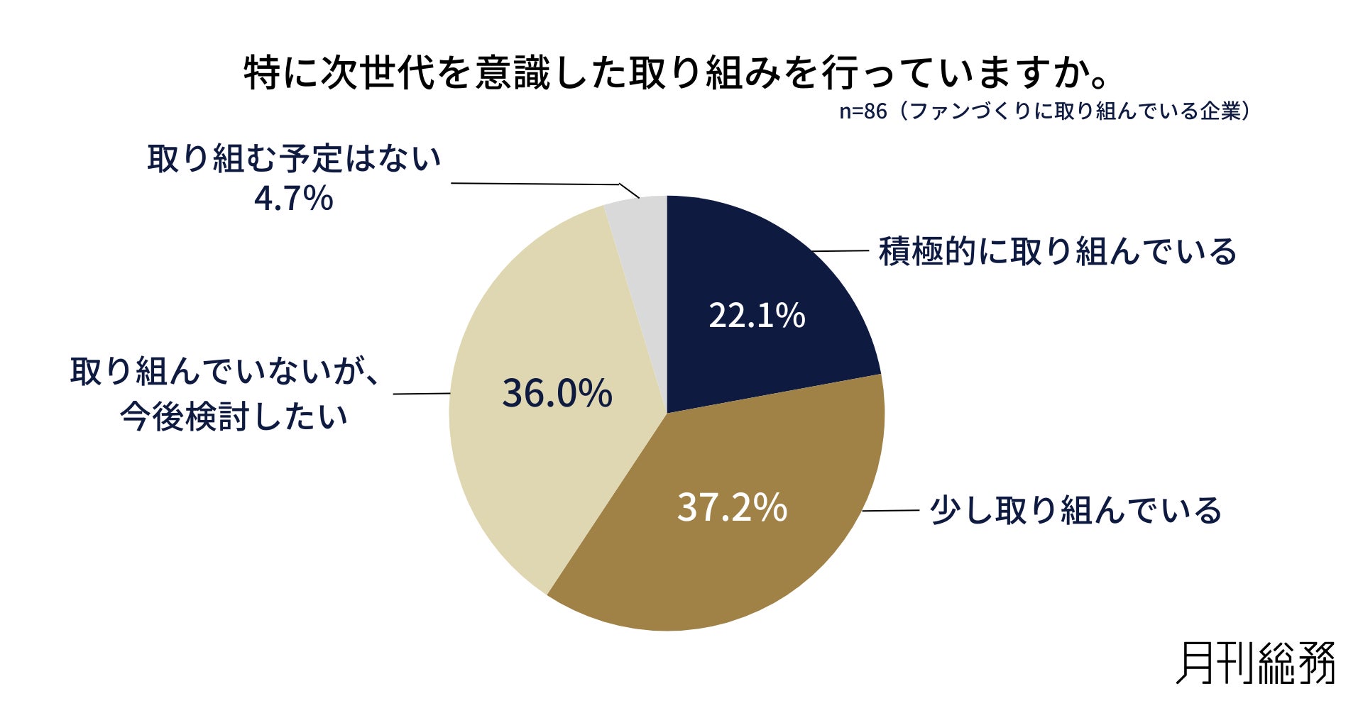 特に次世代を意識した取り組みを行っているか尋ねたところ、「積極的に取り組んでいる」が22.1%、「少し取り組んでいる」が37.2%となりました。一方で、「取り組んでいないが、今後検討したい」も36.0%を占め、模索段階の企業が多い状況です(n=86/ファンづくりに取り組んでいる企業)。