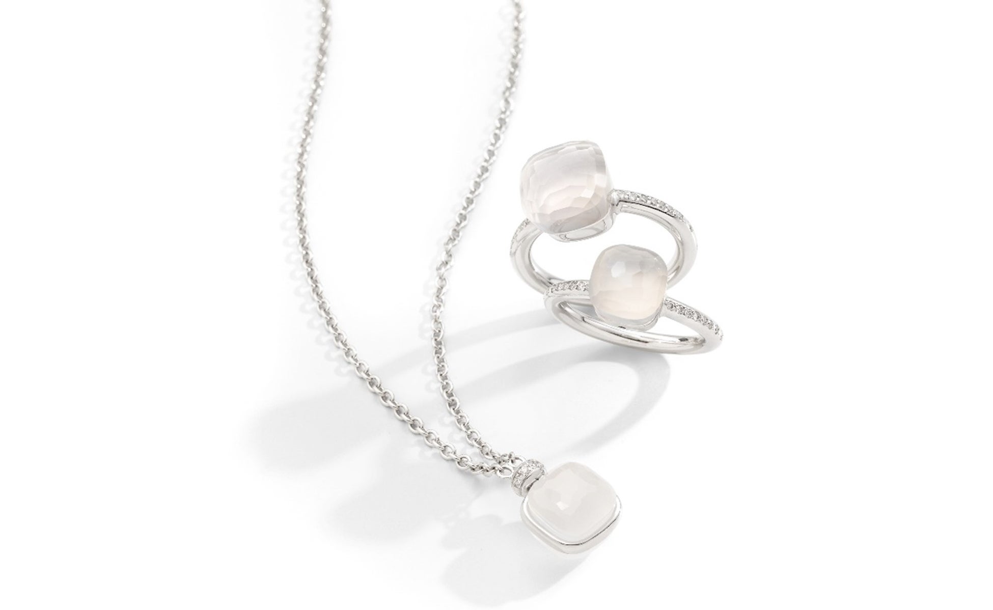 クラシックとプチサイズのリング、そしてペンダントとイヤリングで構成された新作は、ミラノの華やかさを毎日身にまとうことのできる、まったく新しいデザインです。マンガンホワイトゴールドと呼ばれる、ロジウムコーティングを必要とせずより長く輝く新しいゴールドには、ミルキークォーツが自然に溶け込みます。リングとイヤリングには、ペンダントと同様にホワイトダイヤモンドがあしらわれています。さらに、ペンダントとイヤリングのダブルストーンはゴールドのバンドで組み合わされた「クレシドラ」カットがほどこされています。ボリュームと深みのあるカラーだけでなく、ジュエリーを直接肌に乗せることで、ストーンをより身近に感じられるでしょう。