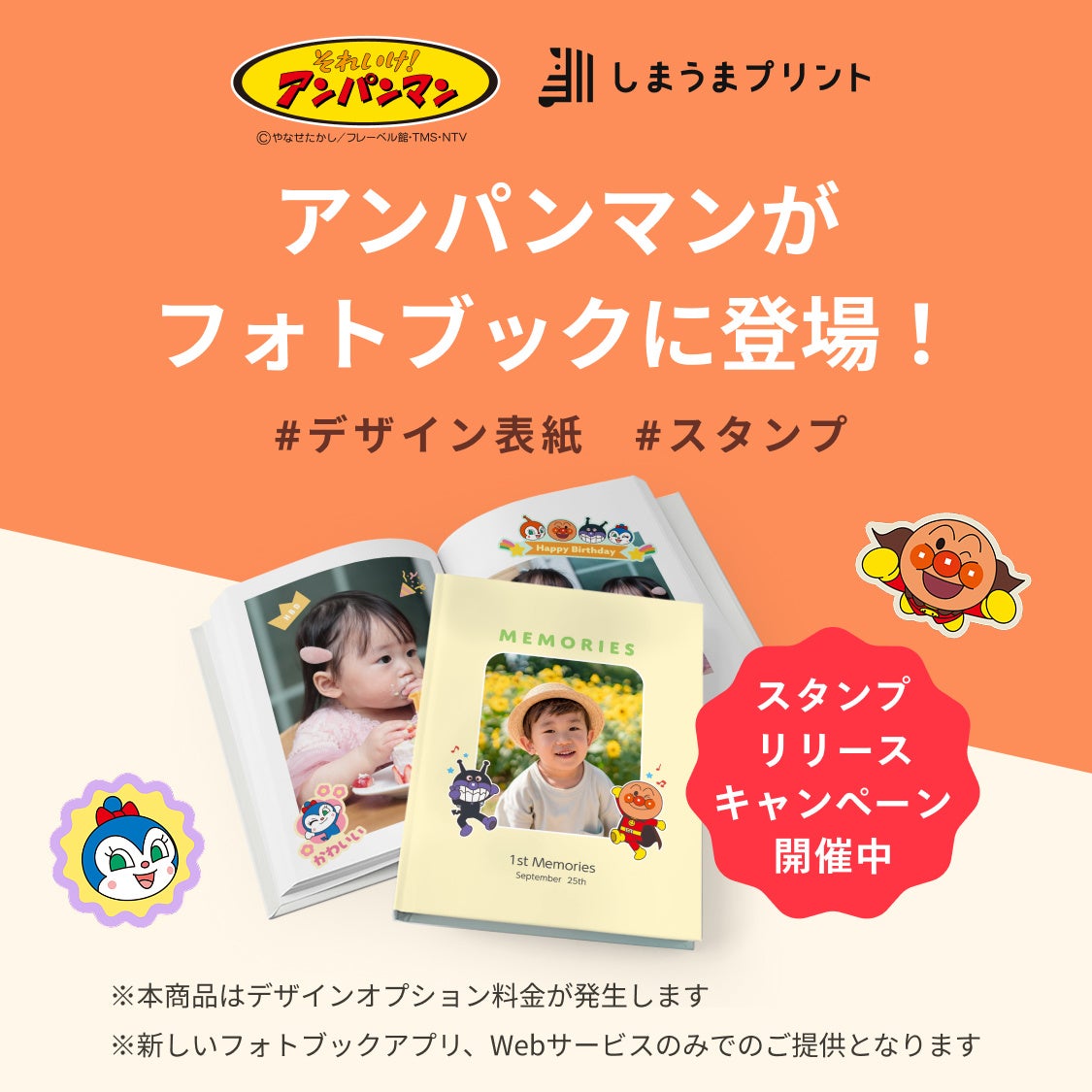ご好評の「それいけ!アンパンマン」デザインに、専用スタンプが新登場!全30種類以上のスタンプで、お子様の成長記録をもっと可愛くデコレーション。