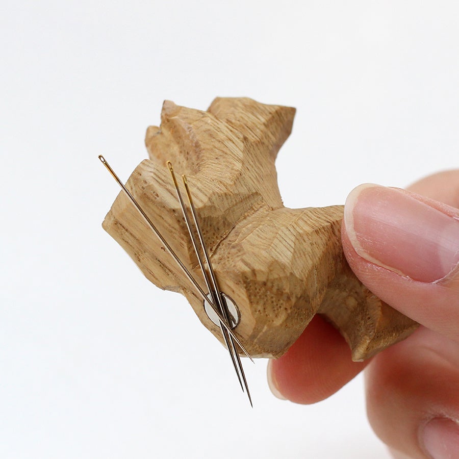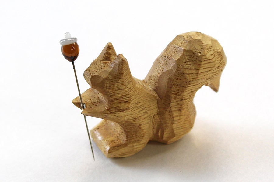 木彫りのリスの針やすめです。CohanaのCoとリスを組み合わせ、コリス。Coの「いっしょに」という意味もふまえて、お裁縫時間の良いおともとなるように、想いを込めてコリスと名付けました。