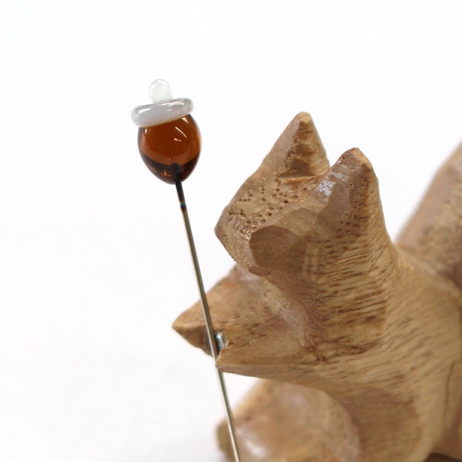 そんなコリスが両手で大切そうに抱えているのは、ガラスでできた小さなどんぐりの待針。まるでとっておきの宝物を、「どうぞ」と差し出してくれているようです。