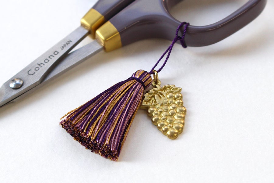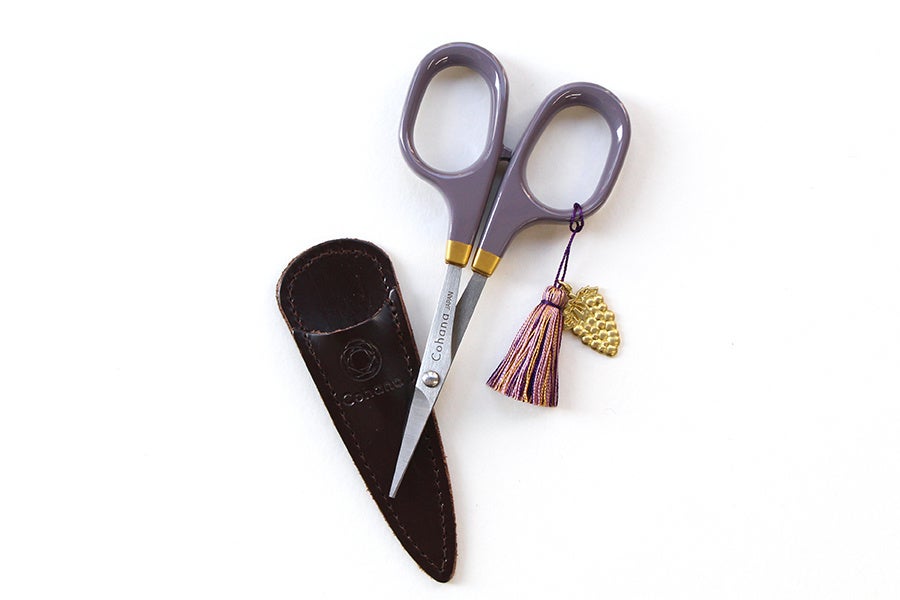 また、特別な淡いぶどう色をまとった漆塗りの小ばさみも同時発売いたします。こちらは、真ちゅうのぶどうチャームとタッセルが付属します。