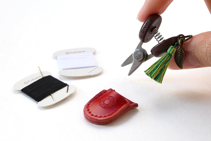 関の豆ばさみには、グリーンミックスのタッセルと、葉っぱのチャームをつけました。赤い革ケースは、りんごの実をイメージした赤色です。指でつまむように持つだけで糸が切れるので、頻繁に糸を切るような作業中も、ストレスなく使うことができます。