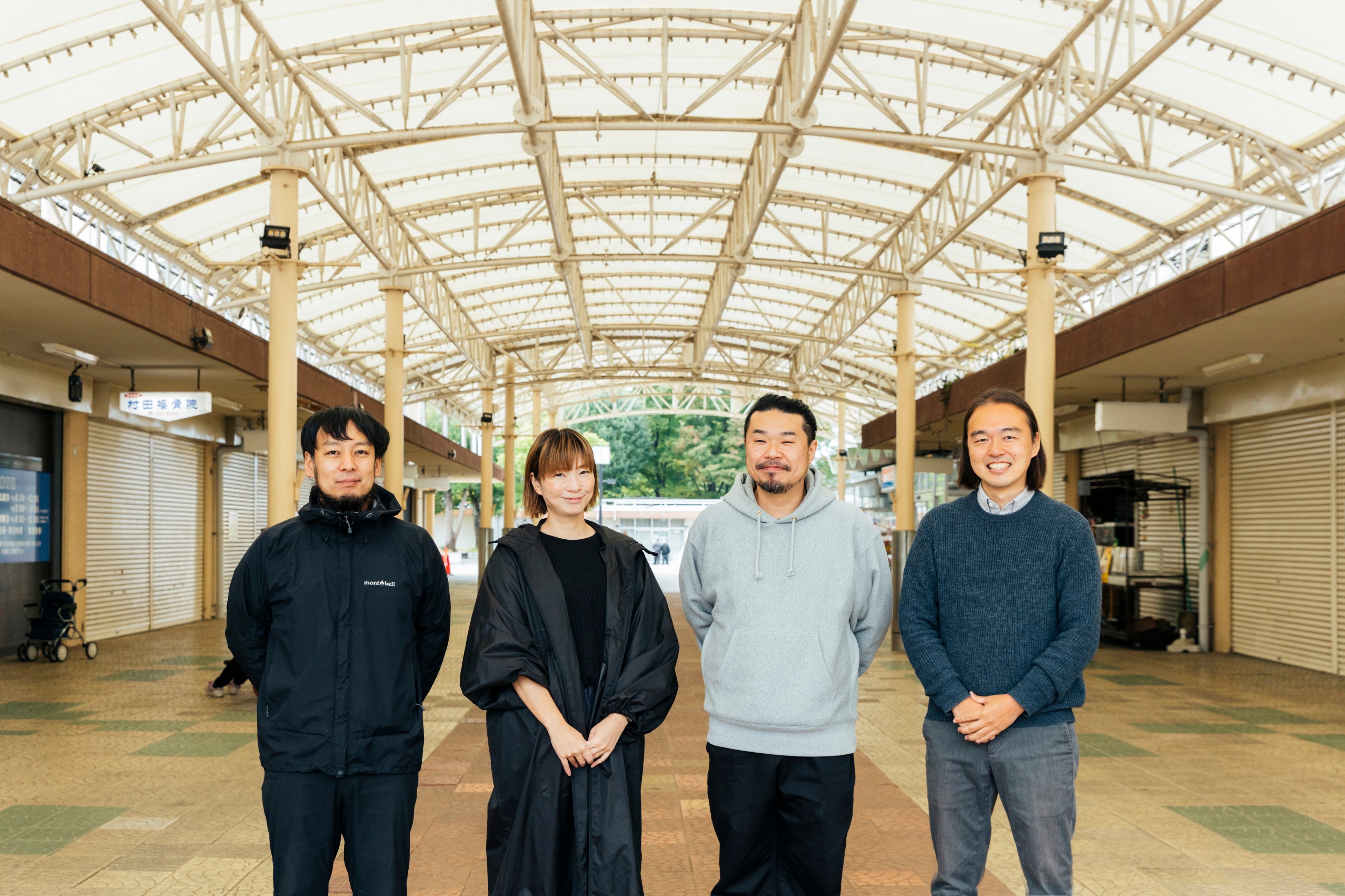 北本団地商店街に立つまちづくりチーム「暮らしの編集室」メンバー(左端、右端)と、今回オープンする『エンバイボックス』『うえのへや写真館』を運営するアーティスト(中央2人)