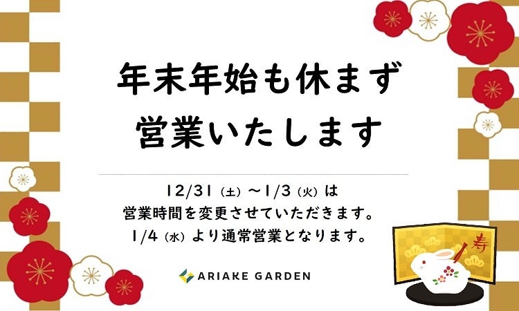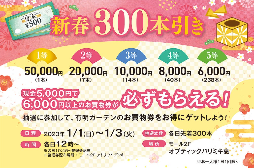 | 日時:2023 年 1 月 1 日 (日) ~ 2023 年 1 月 3 日 (火) 各日12:00~ 場所:モール2F Gエスカレーター裏(オプティックパリミキ裏) ▼詳細はこちら https://www.shopping-sumitomo-rd.com/ariake/event/detail/1130/ |