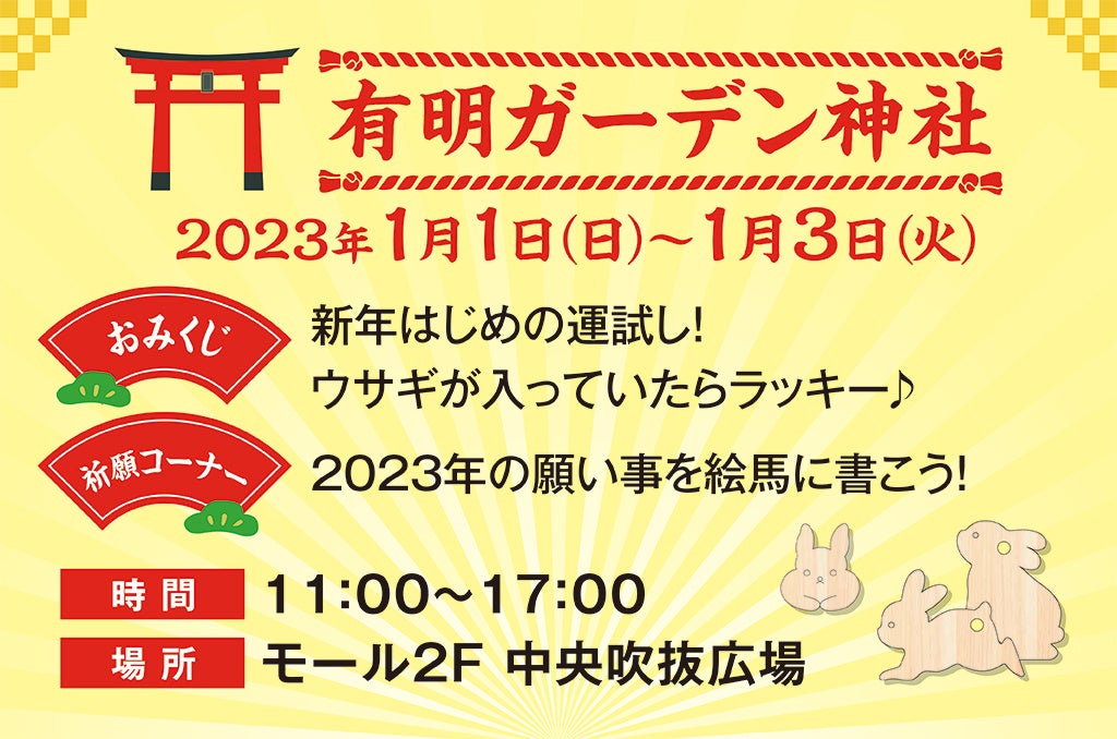 | 日時:2023 年 1 月 1 日 (日) ~ 2023 年 1 月 3 日 (火) 11:00~17:00 場所:モール2F 中央吹抜広場 参加費:おみくじは当日のレシート引き換えで先着順。絵馬は無料、先着順。 ▼詳細はこちら https://www.shopping-sumitomo-rd.com/ariake/event/detail/1131/ |