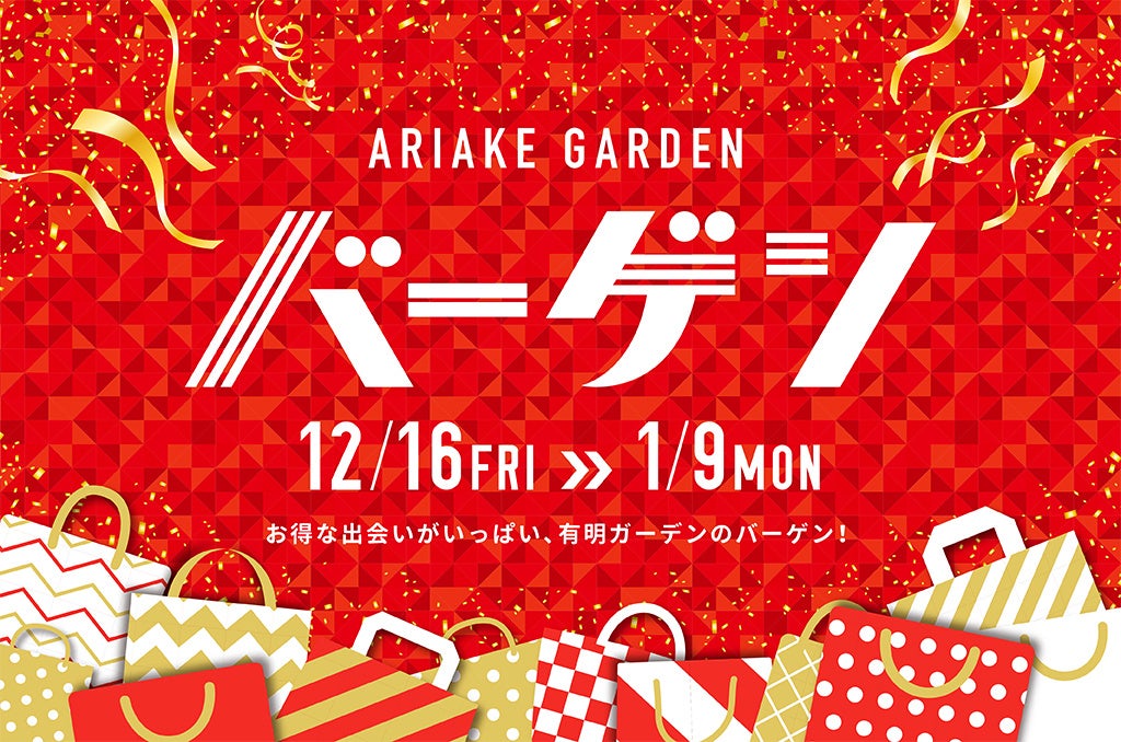 | 期間:2022年12月16日(金)~2023年1月9日(月・祝) ▼バーゲンで買いたい特集はこちら https://www.shopping-sumitomo-rd.com/ariake/pickup/#Feature48 |