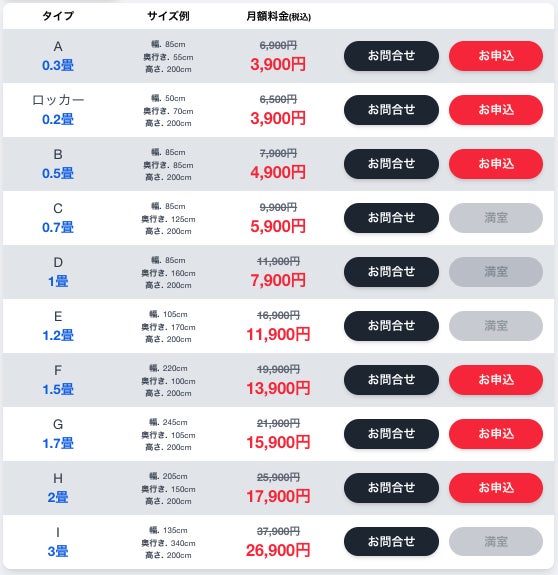 2畳タイプ:通常25,900円→17.900円